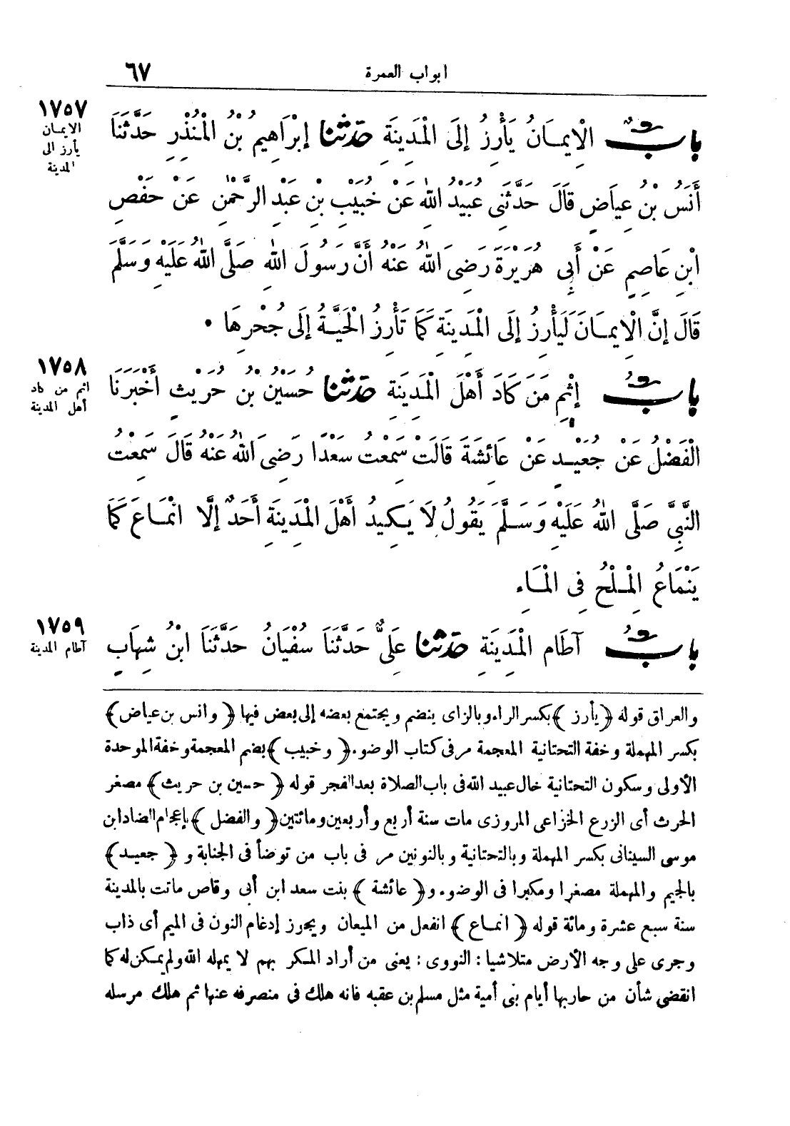 والعراق قوله {يأرز} بكسر الراء وبالزاي ينضم ويجتمع بعضه إلى بعض فيها {وأنس بن عياض} بكسر المهملة وخفة التحتانية المعجمة مر في كتاب الوضوء {وخبيب} بضم المعجمة وخفة الموحدة الأولى وسكون التحتانية خال عبيد الله في باب صلاة بعد الفجر قوله {حسين بن حريث} مصغر الحرث أي الزرع الخزاعي المروزي مات سنة أربع وأربعين ومائتين {والفضل} بإعجام الضاد ابن موسى السيناني بكسر المهملة وبالتحتانية وبالنونين مر في باب من توضأ في الجنابة و {جعيد} بالجيم والمهملة مصغرا ومكبرا في الوضوء و {عائشة} بنت سعد ابن أبي وقاص ماتت بالمدينة سنة سبع عشرة ومائة قوله {انماع} انفعل من الميعان ويجوز إدغام النون في الميم أي ذاب وجرى على وجه الأرض متلاشيا: النووي: يعني من أراد المكر بهم لا يمهله الله ولم يكن له كما انقضى شأن من حاربها أيام بني أمية مثل مسلم بن عقبة فإنه هلك في منصرفه عنها ثم هلك مرسله