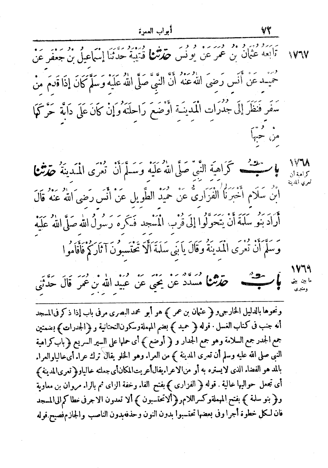 ونحوها بالدليل الخارجي و {عثمان بن عمر} هو أبو محمد البصري مر في باب إذا ذكر في المسجد أنه جنب في كتاب الغسل, قوله {حميد} بضم المهملة وسكون التحتانية و {الجدرات} بضمتين جمع الجدر جمع السلامة وهو جمع جدار وٍ {أوضع} أي حملها على السير السريع {باب كراهية النبي صلى الله عليه وسلم أن تعري المدينة} من العراء وهو الخلو يقال ترك عراء أي خاليا والعراء بالمد هو الفضاء الذي لا يستره به أو من الإعراء يقال أعريت المكان أي جعلته خاليا و {تعري المدينة} أي تجعل حواليها خالية ,قوله {الفزاري} بالفتح الفاء وخفة الزاي ثم بالراء مروان بن معاوية و {بنو سلمة} بفتح المهملة وكسر اللام و {ألا تحتسبون} ألا تعدون الأجر في خطاكم إلى المسجد فإن لكل خطوة أجرا وفي بعضها تحتسبوا بدون النون وحذفه بدون الناصب والجازم فصيح قوله