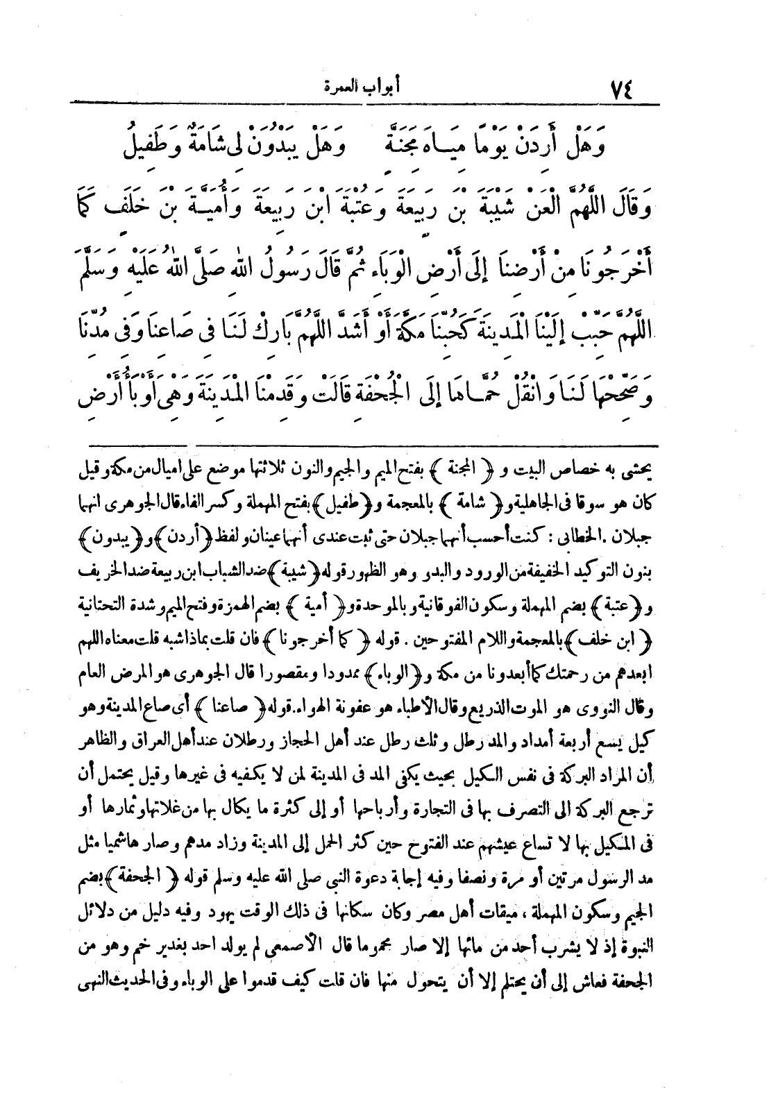 يحشى به خصاص البيت و {المجنة} بفتح الميم والجيم والنون ثلاثتها موضع على أميال من مكة وقيل كان هو سوقا في الجاهلية و {شامة} بالمعجمة و {طفيل} بفتح المهملة وكسر الفاء قال الجوهري إنهما جبلان, الخطابي: كنت أحسب أنهما جبلان حتى ثبت عندي أنهما عينان ولفظ {أردن} و {يبدون} بنون التوكيد الخفيفة من الورود والبدو وهو الظهور قوله {شيبة} ضد الشباب ابن ربيعة ضد الخريف و {عتبة} بضم المهملة وسكون الفوقانية وبالموحدة و {أمية} بضم الهمزة وفتح الميم وشدة التحتانية {ابن خلف} بالمعجمة واللام المفتوحتين, وقوله {كما أخرجونا} فإن قلت بماذا شبه قلت معناه اللهم أبعدهم من رحمتك كما أبعدونا من مكة و {الوباء} ممدودا ومقصورا قال الجوهري هو المرض العام وقال النووي هو الموت الذريع وقال الأطباء هو عفونة الهواء, قوله {صاعنا} أي صاع المدينة وهو كيل يسع أربعة أمداد والمد رطل وثلث رطل عند أهل الحجاز ورطلان عند أهل العراق والظاهر أن المراد البركة في نفس الكيل بحيث يكفي المد في المدينة لمن لا يكفيه في غيرها وقيل يحتمل أن ترجع البركة إلى التصرف بها في التجارة وأرباحها أو إلى كثرة ما يكال بها من غلاتها وثمارها أو في المكيل بها لا تساع عيثهم عند الفتوح حين كثرة الحمل إلى المدينة وزاد مدهم وصار هاشميا مثل مد الرسول مرتين أو مرة ونصفا وفيه إجابة دعوة النبي صلى الله عليه وسلم قوله {الجحفة} بضم الجيم وسكون المهملة , ميقات أهل مصر وكان سكانها في ذلك الوقت يهود وفيه دليل من دلائل النبوة إذ لا يشرب أحد من مائها إلا صار محموما قال الأصمعي لم يولد أحد بغدير خم وهو من الجحفة فعاش إلى ان يحتلم إلا أن يتحول منها فإن قلت كيف قدموا على الوباء وفي الحديث النهي