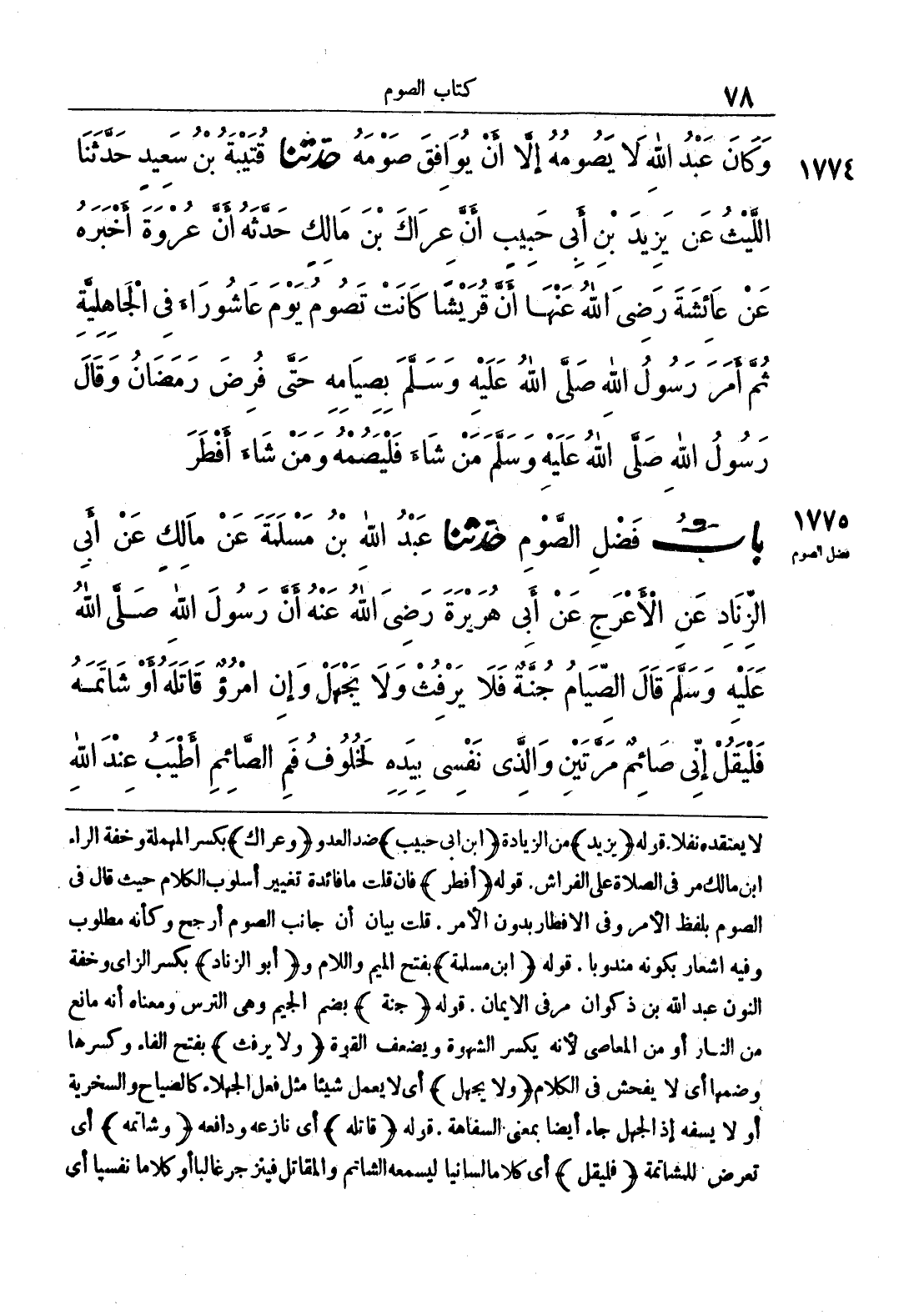 لا يعتقده نفلا, قوله {يزيد} من الزيادة {ابن أبي حبيب} ضد العدو {وعراك} بكسر المهملة وخفة الراء ابن مالك مر في الصلاة على الفراش, قوله {أفطر} فإن قلت ما فائدة تغيير أسلوب الكلام حيث قال في الصوم بلفظ الأمر وفي الإفطار بدون الأمر, قلت بيان أن جانب الصوم أرجح وكأنه مطلوب وفيه إشعار بكونه مندوبا, قوله {ابن مسلمة} بفتح الميم واللام و {أبو الزناد} بكسر الزاي وخفة النون عبد الله بن ذكوان مر في الإيمان, قوله {جنة} بضم الجيم وهي الترس ومعناه أنه مانع من النار أو من المعاصي لأنه يكسر الشهوة ويضعف القوة {ولا يرفث} بفتح الفاء وكسرها وضمها أي لا يفحش في الكلام {ولا يجهل} أي لا يعمل شيئا مثل فعل الجهلاء كالصياح والسخرية أو لا يسفه إذ الجهل جاء أيضا بمعنى السفاهة , قوله {قاتله} أي نازعه ودافعه {وشاتمه} أي تعرض للمشاتمة {فليقل} أي كلاما لسانيا ليسمعه الشتائم والمقاتل فينزجر غالبا أو كلاماً نفسياً أي