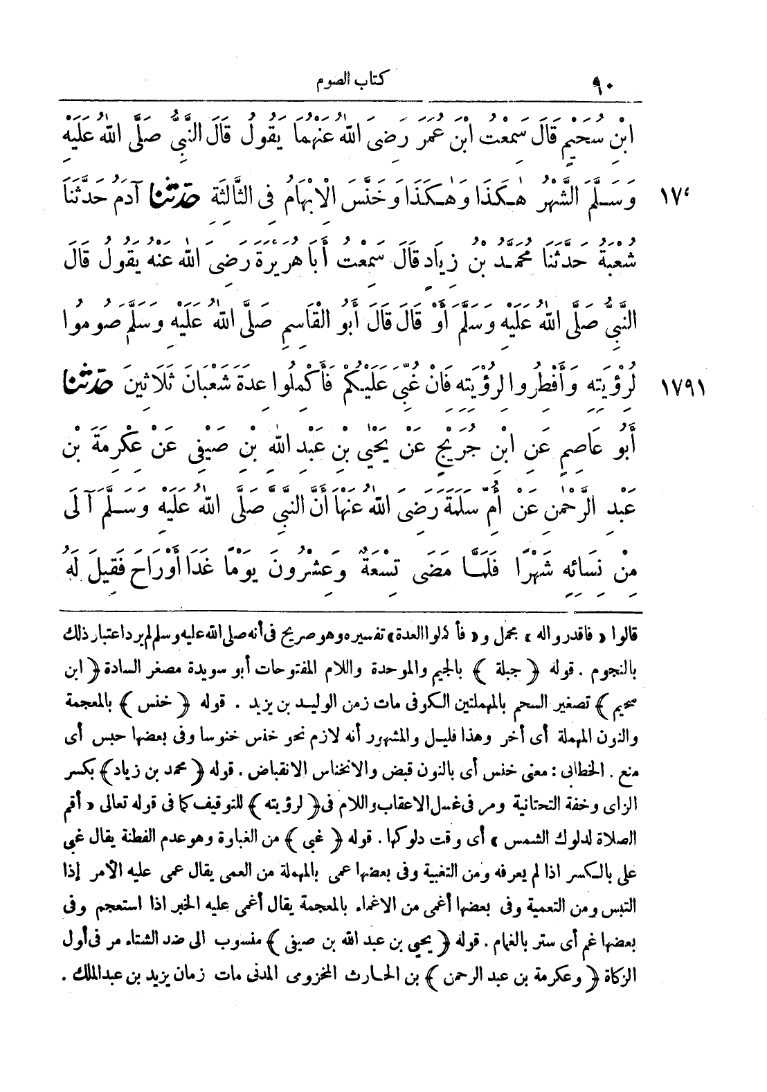 قالوا «فاقدروا له» مجمل و «فأكملوا العدة» تفسيره وهو صريح في أنه صلى الله عليه وسلم لم يرد اعتبار ذلك بالنجوم, قوله {جبلة} بالجيم والموحدة واللام المفتوحات أبو سويدة مصغر السادة {ابن سحيم} تصغير السحم بالمهملتين الكوفي مات زمن الوليد بن يزيد, قوله {خنس} بالمعجمة والنون المهملة أي أخر وهذا قليل والمشهور أنه لازم نحو خنس خنوسا وفي بعضها حبس أي منع, الخطابي: معنى خنس أي بالنون قبض والانخناس الانقباض, قوله {محمد بن زياد} بكسر الزاي وخفة التحتانية ومر في غسل الأعقاب واللام في {لرؤيته} للتوقيف كما في قوله تعالى «أقم الصلاة لدلوك الشمس» أي وقت دلوكها, قولها {غبي} من الغباوة وهو عدم الفطنة يقال غبي على بالكسر إذا لم يعرفه ومن التغبية وفي بعضها عمي بالمهملة من العمي يقال عمي عليه الأمر إذا التبس ومن التعمية وفي بعضها أغمي من الإغماء بالمعجمة يقال أغمي عليه الخبر إذا استعجم وفي بعضها غم أي ستر بالغمام, قوله {يحي بن عبد الله بن صيفي} منسوب إلى ضد الشتاء مر في أول الزكاة {وعكرمة بن عبد الرحمن} بن الحارث المخزومي المدني مات زمان يزيد بن عبد الملك.