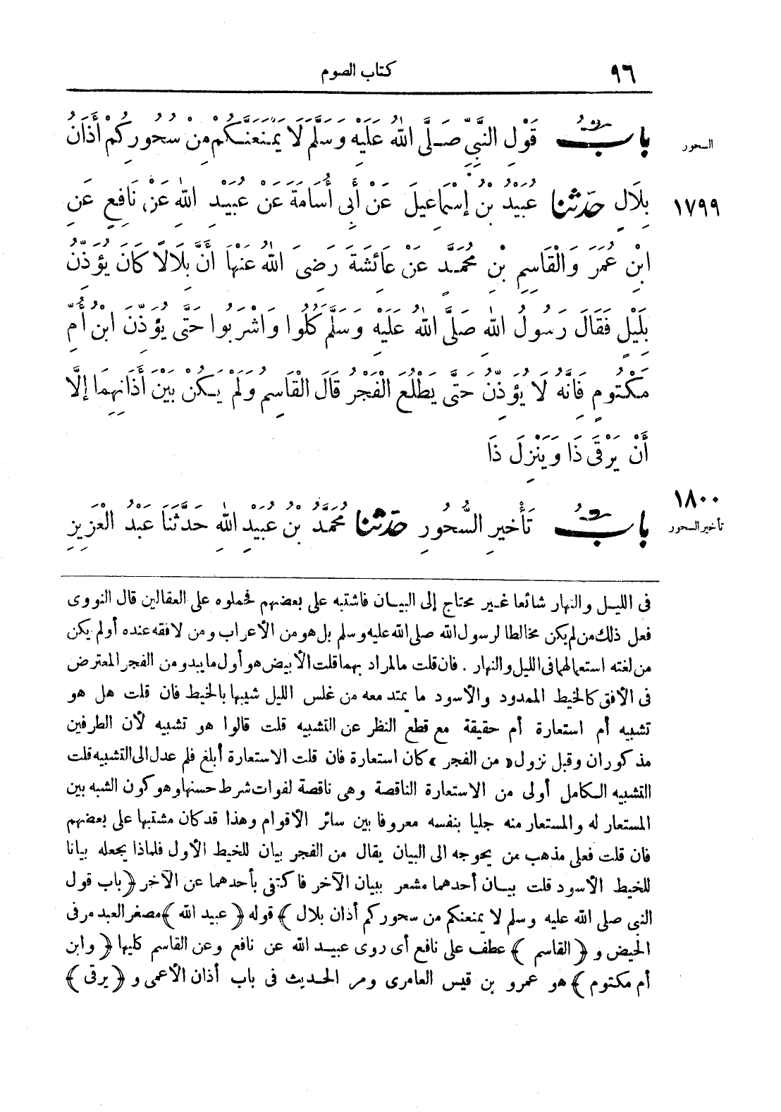 في الليل والنهار شائعا غير محتاج إلى البيان فاشتبه على بعضهم فحملوه على العقالين قال النووي فعل ذلك من لم يكن مخالطا لرسول الله صلى الله عليه وسلم بل هو من الأعراب ومن لا فقه عنده أو لم يكن من لغته استعمالهما في الليل والنهار, فإن قلت ما لمراد بهما قلت الأبيض هو أول ما يبدو من الفجر المعترض في الأفق كالخيط الممدود والأسود ما يمتد معه من غلس الليل شيبها بالخيط فإن قلت هل هو تشبيه أم استعارة أم حقيقة مع قطع النظر عن التشبيه قلت قالوا هو تشبيه لأن الطرفين مذكوران وقبل نزول «من الفجر» كان استعارة فإن قلت الاستعارة أبلغ فلم عدل إلى التشبيه قلت التشبيه الكامل أولى من الاستعارة الناقصة وهي ناقصة لفوات شرط حسنها وهو كون الشبه بين المستعار له والمستعار منه جليا بنفسه معروفا بين سائر الأقوام وهذا قد كان مشتبها على بعضهم فإن قلت فعلى مذهب من يحوجه إلى البيان يقال من الفجر بيان للخيط الأول فلماذا يجعله بيانا للخيط الأسود قلت بيان أحدهما مشعر ببيان الآخر فاكتفى بأحدهما عن الآخر {باب قول النبي صلى الله عليه وسلم لا يمنعكم من سحوركم أذان بلال} قوله {عبيد الله} مصغر العبد مر في الحيض و {القاسم} عطف على نافع أي روى عبيد الله عن نافع وعن القاسم كليهما {وابن أم مكتوم} هو عمرو بن قيس العامري ومر الحديث في باب أذان الأعمى و {يرقى}