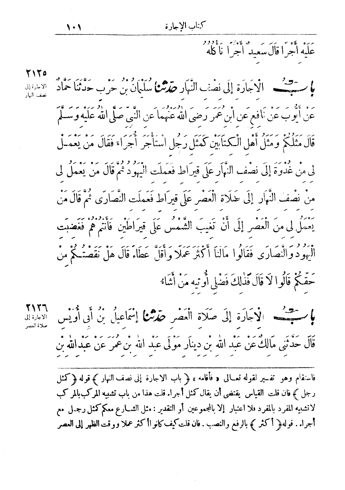 2125 - حَدَّثَنَا سُلَيْمَانُ بْنُ حَرْبٍ حَدَّثَنَا حَمَّادٌ عَنْ أَيُّوبَ عَنْ نَافِعٍ عَنْ ابْنِ عُمَرَ رَضِيَ اللَّهُ عَنْهُمَا عَنْ النَّبِيِّ صَلَّى اللَّهُ عَلَيْهِ وَسَلَّمَ قَالَ مَثَلُكُمْ وَمَثَلُ أَهْلِ الْكِتَابَيْنِ كَمَثَلِ رَجُلٍ اسْتَاجَرَ أُجَرَاءَ فَقَالَ مَنْ يَعْمَلُ لِي مِنْ غُدْوَةَ إِلَى نِصْفِ النَّهَارِ عَلَى قِيرَاطٍ فَعَمِلَتْ الْيَهُودُ ثُمَّ قَالَ مَنْ يَعْمَلُ لِي مِنْ نِصْفِ النَّهَارِ إِلَى صَلَاةِ الْعَصْرِ عَلَى قِيرَاطٍ فَعَمِلَتْ النَّصَارَى ثُمَّ قَالَ مَنْ يَعْمَلُ لِي مِنْ الْعَصْرِ إِلَى أَنْ تَغِيبَ الشَّمْسُ عَلَى قِيرَاطَيْنِ فَأَنْتُمْ هُمْ فَغَضِبَتْ الْيَهُودُ وَالنَّصَارَى فَقَالُوا مَا لَنَا أَكْثَرَ عَمَلًا وَأَقَلَّ عَطَاءً قَالَ هَلْ نَقَصْتُكُمْ مِنْ حَقِّكُمْ قَالُوا لَا قَالَ فَذَلِكَ فَضْلِي أُوتِيهِ مَنْ أَشَاءُ