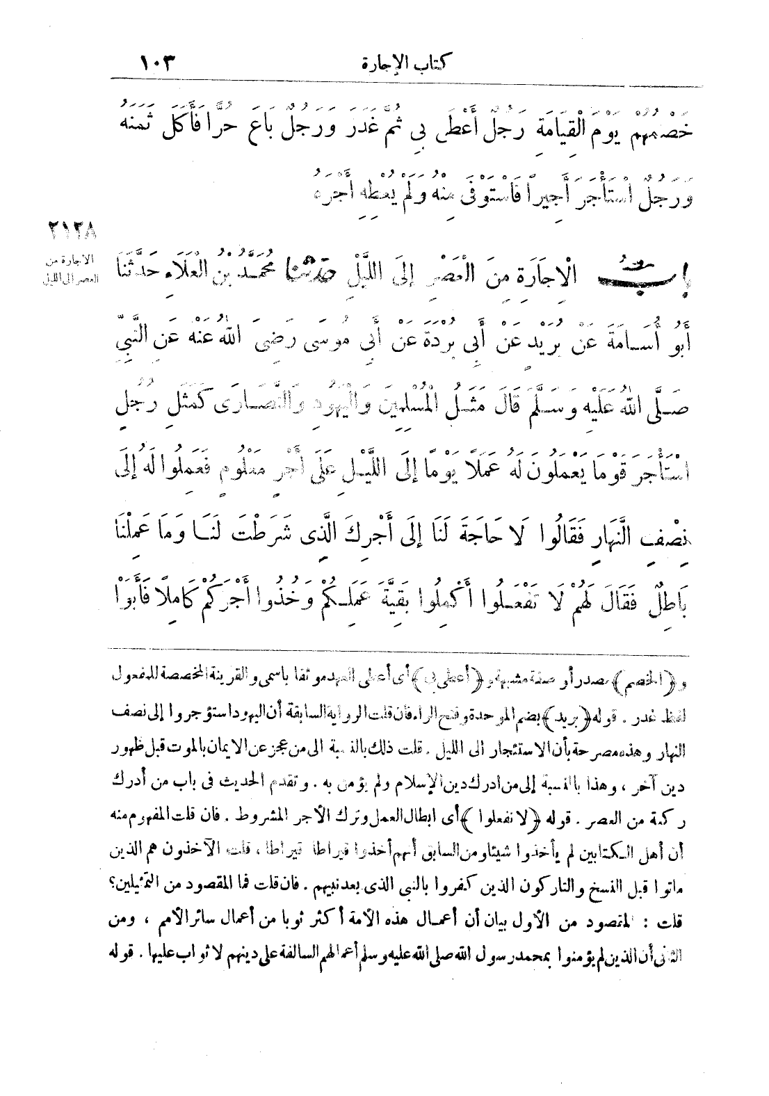 2128 - حَدَّثَنَا مُحَمَّدُ بْنُ الْعَلَاءِ حَدَّثَنَا أَبُو أُسَامَةَ عَنْ بُرَيْدٍ عَنْ أَبِي بُرْدَةَ عَنْ أَبِي مُوسَى رَضِيَ اللَّهُ عَنْهُ عَنْ النَّبِيِّ صَلَّى اللَّهُ عَلَيْهِ وَسَلَّمَ قَالَ مَثَلُ الْمُسْلِمِينَ وَالْيَهُودِ وَالنَّصَارَى كَمَثَلِ رَجُلٍ اسْتَاجَرَ قَوْمًا يَعْمَلُونَ لَهُ عَمَلًا يَوْمًا إِلَى اللَّيْلِ عَلَى أَجْرٍ مَعْلُومٍ فَعَمِلُوا لَهُ إِلَى نِصْفِ النَّهَارِ فَقَالُوا لَا حَاجَةَ لَنَا إِلَى أَجْرِكَ الَّذِي شَرَطْتَ لَنَا وَمَا عَمِلْنَا بَاطِلٌ فَقَالَ لَهُمْ لَا تَفْعَلُوا أَكْمِلُوا بَقِيَّةَ عَمَلِكُمْ وَخُذُوا أَجْرَكُمْ كَامِلًا فَأَبَوْا
