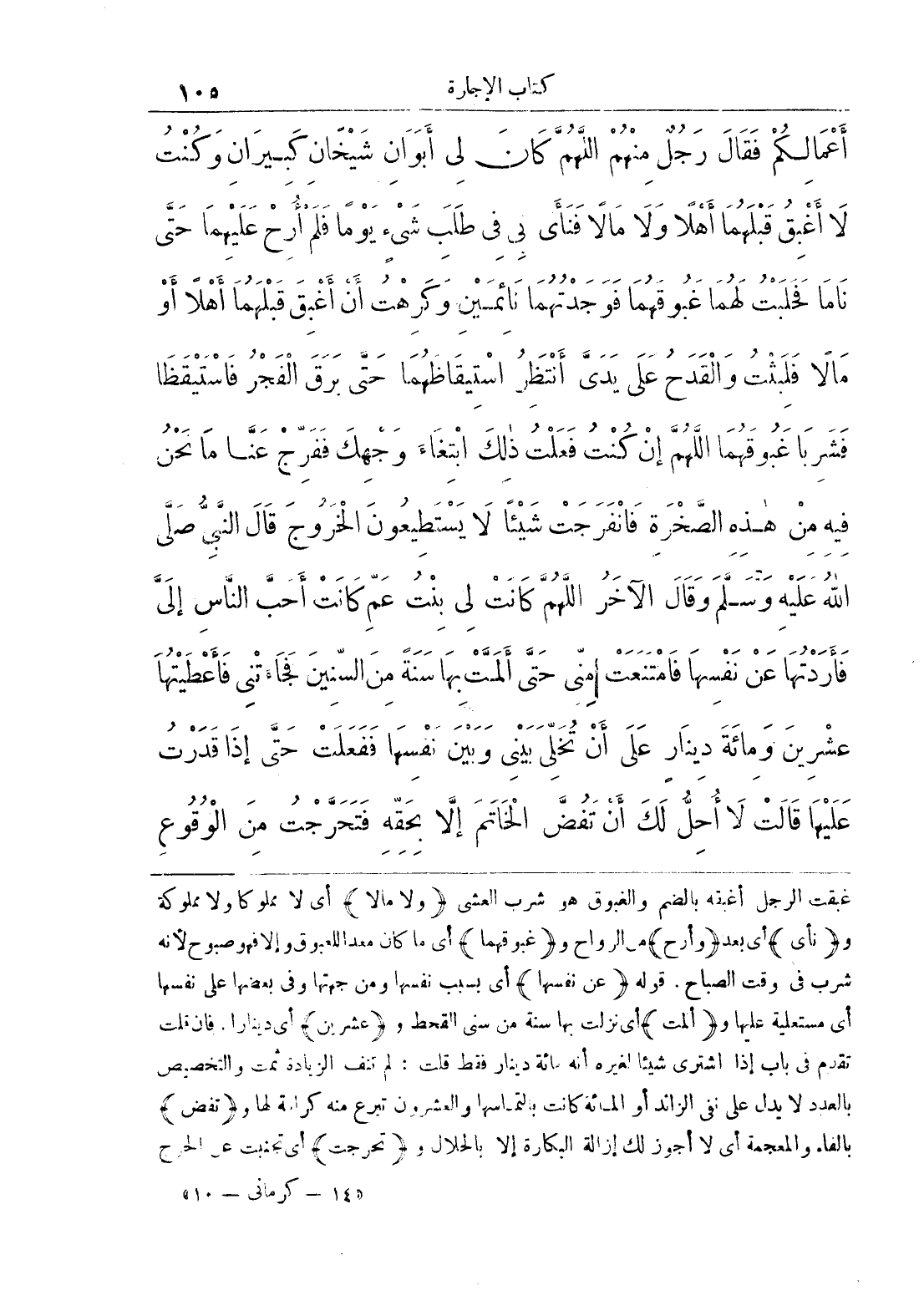 أَعْمَالِكُمْ فَقَالَ رَجُلٌ مِنْهُمْ اللَّهُمَّ كَانَ لِي أَبَوَانِ شَيْخَانِ كَبِيرَانِ وَكُنْتُ لَا أَغْبِقُ قَبْلَهُمَا أَهْلًا وَلَا مَالًا فَنَأَى بِي فِي طَلَبِ شَيْءٍ يَوْمًا فَلَمْ أُرِحْ عَلَيْهِمَا حَتَّى نَامَا فَحَلَبْتُ لَهُمَا غَبُوقَهُمَا فَوَجَدْتُهُمَا نَائِمَيْنِ وَكَرِهْتُ أَنْ أَغْبِقَ قَبْلَهُمَا أَهْلًا أَوْ مَالًا فَلَبِثْتُ وَالْقَدَحُ عَلَى يَدَيَّ أَنْتَظِرُ اسْتِيقَاظَهُمَا حَتَّى بَرَقَ الْفَجْرُ فَاسْتَيْقَظَا فَشَرِبَا غَبُوقَهُمَا اللَّهُمَّ إِنْ كُنْتُ فَعَلْتُ ذَلِكَ ابْتِغَاءَ وَجْهِكَ فَفَرِّجْ عَنَّا مَا نَحْنُ فِيهِ مِنْ هَذِهِ الصَّخْرَةِ فَانْفَرَجَتْ شَيْئًا لَا يَسْتَطِيعُونَ الْخُرُوجَ قَالَ النَّبِيُّ صَلَّى اللَّهُ عَلَيْهِ وَسَلَّمَ وَقَالَ الْآخَرُ اللَّهُمَّ كَانَتْ لِي بِنْتُ عَمٍّ كَانَتْ أَحَبَّ النَّاسِ إِلَيَّ فَأَرَدْتُهَا عَنْ نَفْسِهَا فَامْتَنَعَتْ مِنِّي حَتَّى أَلَمَّتْ بِهَا سَنَةٌ مِنْ السِّنِينَ فَجَاءَتْنِي فَأَعْطَيْتُهَا عِشْرِينَ وَمِائَةَ دِينَارٍ عَلَى أَنْ تُخَلِّيَ بَيْنِي وَبَيْنَ نَفْسِهَا فَفَعَلَتْ حَتَّى إِذَا قَدَرْتُ عَلَيْهَا قَالَتْ لَا أُحِلُّ لَكَ أَنْ تَفُضَّ الْخَاتَمَ إِلَّا بِحَقِّهِ فَتَحَرَّجْتُ مِنْ الْوُقُوعِ