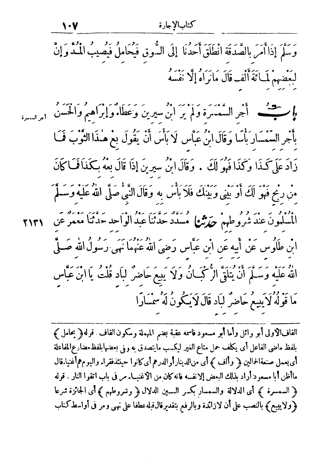 القاف الأولى أبو وائل وأما أبو مسعود فاسمه عقبة بضم المهملة وسكون القاف, قوله ((يحامل)) بلفظ ماضي الفاعل أي يكلف حمل متاع الغير ليكسب ما يتصدق به وفي بعضها بلفظ مضارع المفاعلة أي يعمل صنعة الحمالين ((وألف)) أي من الدينار أو الدرهم أي كانوا حينئذ فقراء واليوم هم أغنياء قال ما أظن أبا مسعود أراد بذلك البعض إلا نفسه فانه كان من الأغنياء مر في باب اتقوا النار, قوله ((السميرة)) أي الدلالة والسمسارة بكسر السين الدلال ((وشروطهم)) أي الجائزة شرعا ((ولا يبيع)) بالنصب على أن لا زائدة وبالرفع بتقدير قال قبلة عطفا على نهى ومر في أواسط كتاب