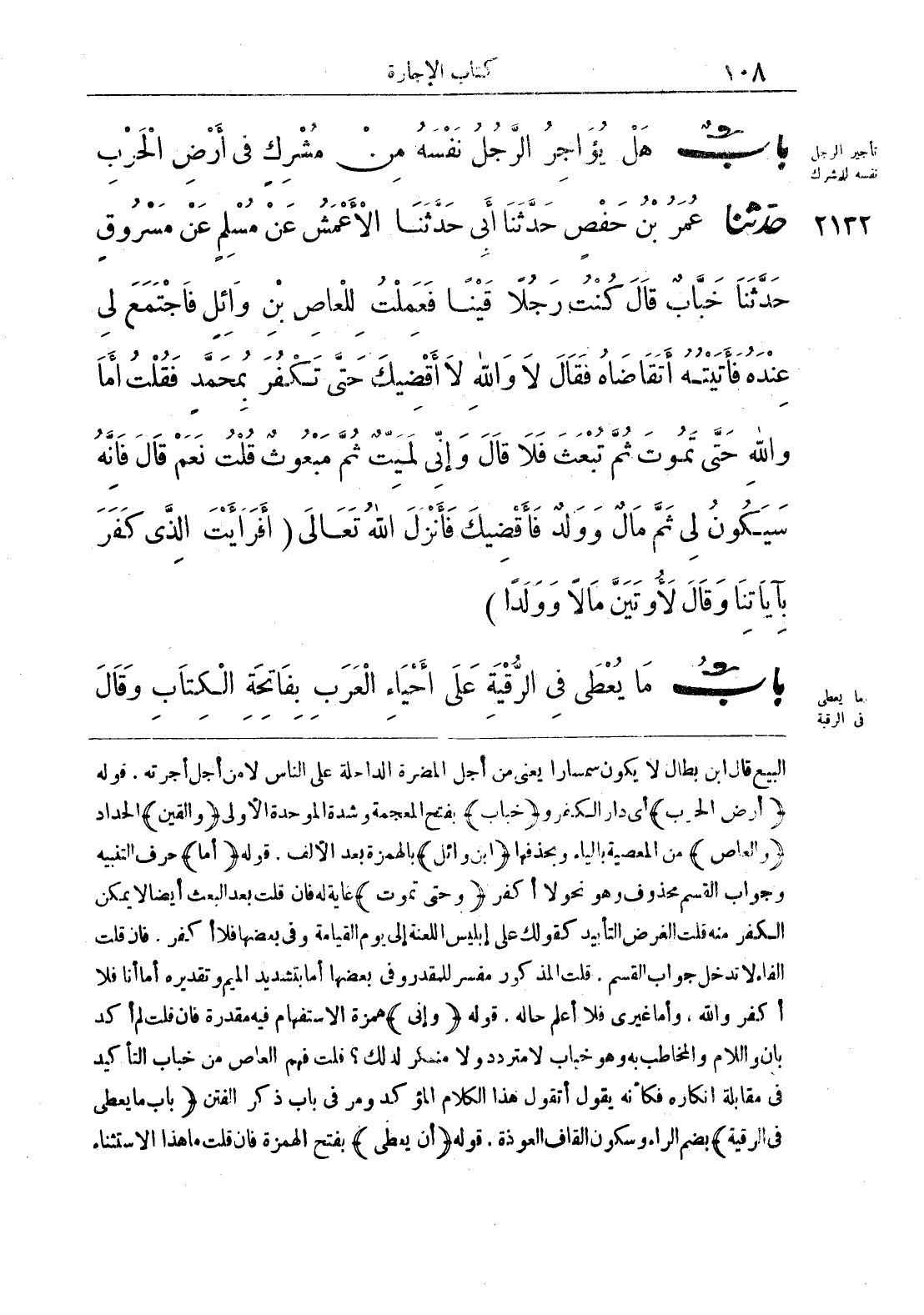 البيع قال ابن بطال لا يكون سمسارا يعني من أجل المضرة الداخلة على الناس لا من أجل أجرته. قوله ((أرض الحرب)) أي دار الكفر و ((خباب)) بفتح المعجمة وشدة الموحدة الأولى ((والقين)) الحداد ((والعاص)) من المعصية بالياء وبحذفها ((ابن وائل)) بالهمزة بعد الألف. قوله ((أما)) حرف التنبيه وجواب القسم محذوف وهو نحو لا أكفر ((وحتى تموت)) غاية له فان قلت بعد البعث أيضا لا يمكن الكفر منه قلت الغرض التأبيد كقولك على إبليس اللعنة إلى يوم القيامة وفي بعضها فلا أكفر, فإن قلت الفاء لا تدخل جواب القسم , قلت المذكور مفسر للمقدر وفي بعضها أما بتشديد الميم وتقديره أما أنا فلا أكفر والله، وأما غيري فلا أعلم حاله. قوله ((وإني)) همزة الاستفهام فيه مقدرة فإن قلت لم أكد بأن واللام والمخاطب به وهو خباب لا متردد ولا منكر لذلك؟ قلت فهم العاص من خباب التأكيد في مقابلة إنكاره فكأنه يقول أتقول هذا الكلام المؤكد ومر في باب ذكر الفتن ((باب ما يعطى في الرقية)) بضم الراء وسكون القاف العودة. قوله ((أن يعطى)) بفتح الهمزة فان قلت ما هذا الاستثناء