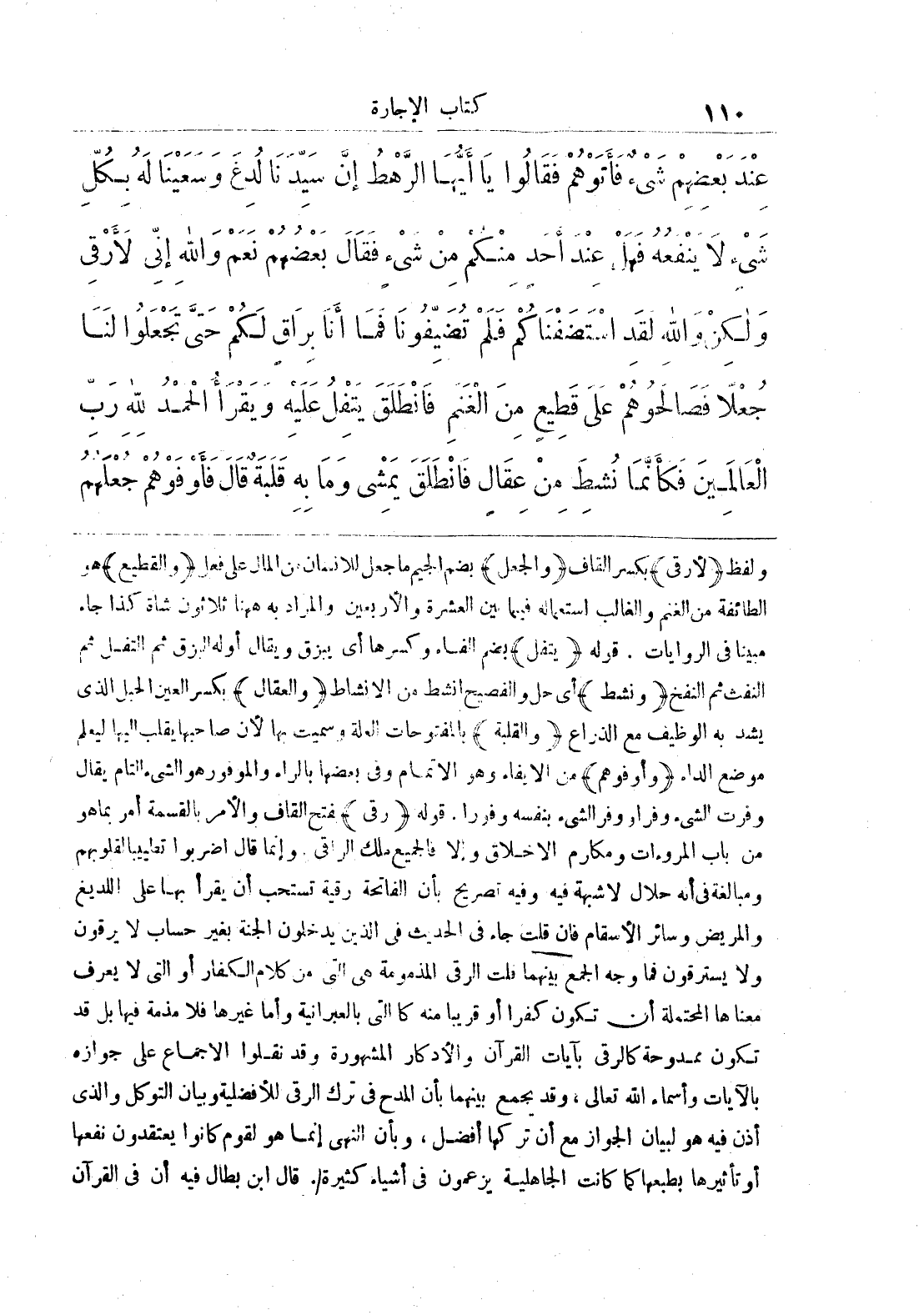 ولفظ ((لأرقي)) بكسر القاف ((والجعل)) بضم الجيم ما جعل الإنسان من المال على فعل ((والقطيع)) هو الطائفة من الغنم والغالب استعماله فيها بين العشرة والأربعين والمراد به ههنا ثلاثون شاة كذا جاء مبينا في الروايات. قوله ((يتفل)) بضم الفاء وكسرها أي يبزق ويقال أوله البزق ثم التفل ثم النفث ثم النفخ ((ونشط) أي حل والفصيح أنشط من الانشاط ((والعقال)) بكسر العين الحبل الذي يشد به الوظيف مع الذراع ((والقبلة)) بالمفتوحات العلة وسميت بها لأن صاحبها يقلب إليها ليعلم موضع الداء ((وأوفوهم)) من الإيفاء وهو الإتمام وفي بعضها بالراء والموفور هو الشيء التام يقال وفرت الشيء وفرا ووفر الشيء بنفسه وفورا. قوله ((رقى)) بفتح القاف والأمر بالقسمة أمر بما هو من أبا المروءات ومكارم الأخلاق وإلا فالجميع ملك الراقي. وإنما قال اضربوا تطييبا لقلوبهم ومبالغة في أنه حلال لا شبهة فيه وفيه تصريح بأن الفاتحة رقية تستحب أن يقرأ بها على اللديغ والمريض وسائر الأسقام فان قلت جاء في الحديث في الذين يدخلون الجنة بغير حساب لا يرقون ولا يسترقون فما وجه الجمع بينهما قلت الرقي المذمومة هي التي من كلام الكفار أو التي لا يعرف معناها المحتملة أن تكون كفرا أو قريبا منه كالتي بالعبرانية وأما غيرها فلا مذمة فيها بل قد تكون ممدوحة كالرقي بآيات القرآن والأذكار المشهورة وقد نقلوا الإجماع على جوازه بالآيات وأسماء الله تعالى، وقد يجمع بينهما بأن المدح في ترك الرقي للأفضلية وبيان التوكل والذي أذن فيه هو لبيان الجواز مع أن تركها أفضل، وبأن النهى إنما هو لقوم كانوا يعتقدون نفعها أو تأثيرها بطبعها كما كانت الجاهلية يزعمون في أشياء كثيرة. قال ابن بطال فيه أن في القرآن