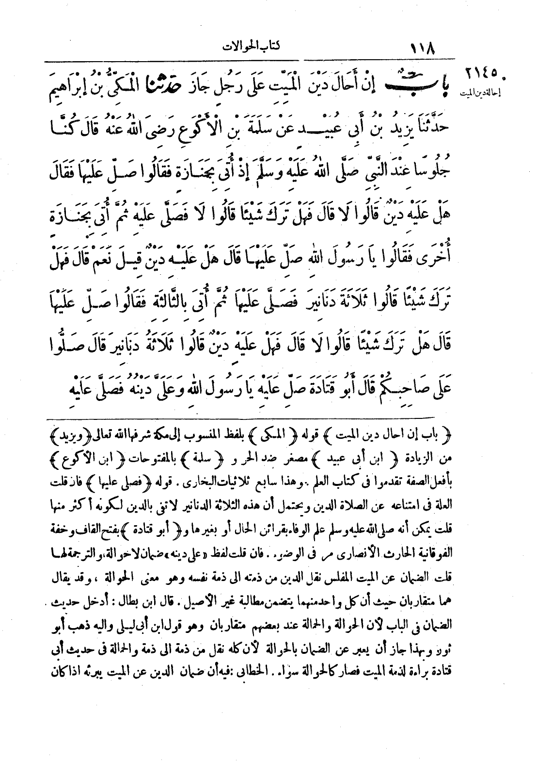2145 - حَدَّثَنَا الْمَكِّيُّ بْنُ إِبْرَاهِيمَ حَدَّثَنَا يَزِيدُ بْنُ أَبِي عُبَيْدٍ عَنْ سَلَمَةَ بْنِ الْأَكْوَعِ رَضِيَ اللَّهُ عَنْهُ قَالَ كُنَّا جُلُوسًا عِنْدَ النَّبِيِّ صَلَّى اللَّهُ عَلَيْهِ وَسَلَّمَ إِذْ أُتِيَ بِجَنَازَةٍ فَقَالُوا صَلِّ عَلَيْهَا فَقَالَ هَلْ عَلَيْهِ دَيْنٌ قَالُوا لَا قَالَ فَهَلْ تَرَكَ شَيْئًا قَالُوا لَا فَصَلَّى عَلَيْهِ ثُمَّ أُتِيَ بِجَنَازَةٍ أُخْرَى فَقَالُوا يَا رَسُولَ اللَّهِ صَلِّ عَلَيْهَا قَالَ هَلْ عَلَيْهِ دَيْنٌ قِيلَ نَعَمْ قَالَ فَهَلْ تَرَكَ شَيْئًا قَالُوا ثَلَاثَةَ دَنَانِيرَ فَصَلَّى عَلَيْهَا ثُمَّ أُتِيَ بِالثَّالِثَةِ فَقَالُوا صَلِّ عَلَيْهَا قَالَ هَلْ تَرَكَ شَيْئًا قَالُوا لَا قَالَ فَهَلْ عَلَيْهِ دَيْنٌ قَالُوا ثَلَاثَةُ دَنَانِيرَ قَالَ صَلُّوا عَلَى صَاحِبِكُمْ قَالَ أَبُو قَتَادَةَ صَلِّ عَلَيْهِ يَا رَسُولَ اللَّهِ وَعَلَيَّ دَيْنُهُ فَصَلَّى عَلَيْهِ
