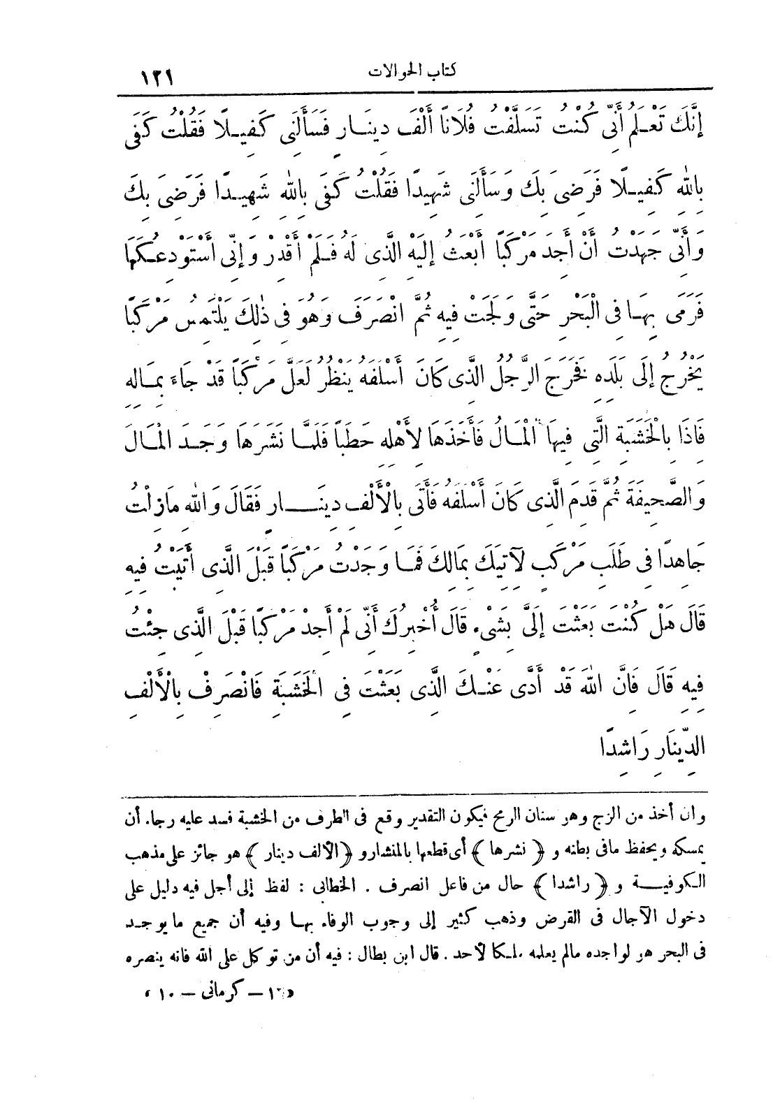 إِنَّكَ تَعْلَمُ أَنِّي كُنْتُ تَسَلَّفْتُ فُلَانًا أَلْفَ دِينَارٍ فَسَأَلَنِي كَفِيلَا فَقُلْتُ كَفَى بِاللَّهِ كَفِيلًا فَرَضِيَ بِكَ وَسَأَلَنِي شَهِيدًا فَقُلْتُ كَفَى بِاللَّهِ شَهِيدًا فَرَضِيَ بِكَ وَأَنِّي جَهَدْتُ أَنْ أَجِدَ مَرْكَبًا أَبْعَثُ إِلَيْهِ الَّذِي لَهُ فَلَمْ أَقْدِرْ وَإِنِّي أَسْتَوْدِعُكَهَا فَرَمَى بِهَا فِي الْبَحْرِ حَتَّى وَلَجَتْ فِيهِ ثُمَّ انْصَرَفَ وَهُوَ فِي ذَلِكَ يَلْتَمِسُ مَرْكَبًا يَخْرُجُ إِلَى بَلَدِهِ فَخَرَجَ الرَّجُلُ الَّذِي كَانَ أَسْلَفَهُ يَنْظُرُ لَعَلَّ مَرْكَبًا قَدْ جَاءَ بِمَالِهِ فَإِذَا بِالْخَشَبَةِ الَّتِي فِيهَا الْمَالُ فَأَخَذَهَا لِأَهْلِهِ حَطَبًا فَلَمَّا نَشَرَهَا وَجَدَ الْمَالَ وَالصَّحِيفَةَ ثُمَّ قَدِمَ الَّذِي كَانَ أَسْلَفَهُ فَأَتَى بِالْأَلْفِ دِينَارٍ فَقَالَ وَاللَّهِ مَا زِلْتُ جَاهِدًا فِي طَلَبِ مَرْكَبٍ لِآتِيَكَ بِمَالِكَ فَمَا وَجَدْتُ مَرْكَبًا قَبْلَ الَّذِي أَتَيْتُ فِيهِ قَالَ هَلْ كُنْتَ بَعَثْتَ إِلَيَّ بِشَيْءٍ قَالَ أُخْبِرُكَ أَنِّي لَمْ أَجِدْ مَرْكَبًا قَبْلَ الَّذِي جِئْتُ فِيهِ قَالَ فَإِنَّ اللَّهَ قَدْ أَدَّى عَنْكَ الَّذِي بَعَثْتَ فِي الْخَشَبَةِ فَانْصَرِفْ بِالْأَلْفِ الدِّينَارِ رَاشِدًا