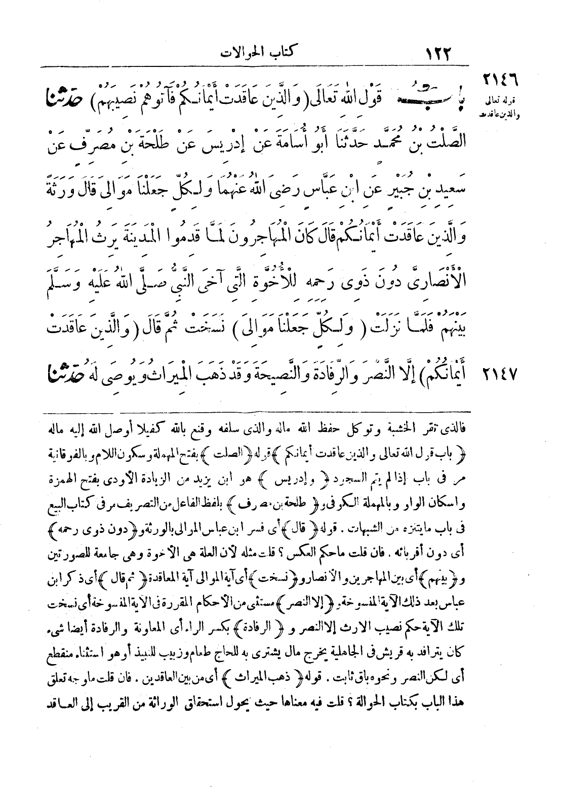 2146 - حَدَّثَنَا الصَّلْتُ بْنُ مُحَمَّدٍ حَدَّثَنَا أَبُو أُسَامَةَ عَنْ إِدْرِيسَ عَنْ طَلْحَةَ بْنِ مُصَرِّفٍ عَنْ سَعِيدِ بْنِ جُبَيْرٍ عَنْ ابْنِ عَبَّاسٍ رَضِيَ اللَّهُ عَنْهُمَا {وَلِكُلٍّ جَعَلْنَا مَوَالِيَ} قَالَ وَرَثَةً {وَالَّذِينَ عَاقَدَتْ أَيْمَانُكُمْ} قَالَ كَانَ الْمُهَاجِرُونَ لَمَّا قَدِمُوا الْمَدِينَةَ يَرِثُ الْمُهَاجِرُ الْأَنْصَارِيَّ دُونَ ذَوِي رَحِمِهِ لِلْأُخُوَّةِ الَّتِي آخَى النَّبِيُّ صَلَّى اللَّهُ عَلَيْهِ وَسَلَّمَ بَيْنَهُمْ فَلَمَّا نَزَلَتْ {وَلِكُلٍّ جَعَلْنَا مَوَالِيَ}