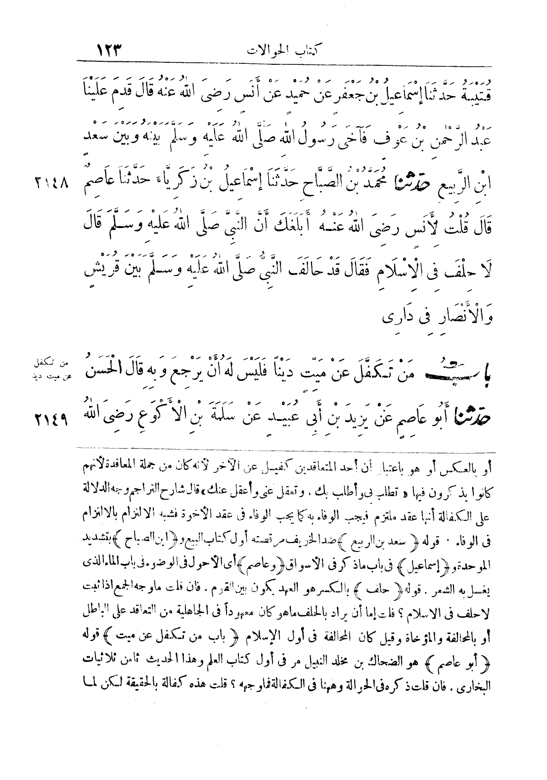 أو بالعكس أو هو باعتبار أن أحد المتعاقدين كفيل عن الأخر لأنه كان من جملة المعاقدة لأنهم كانوا يذكرون فيها» تطلب بي وأطلب بك، وتعقل عنى وأعقل عنك «قال شارح التراجم وجه الدلالة على الكفالة أنها عقد ملتزم فيجب الوفاء به كما يجب الوفاء في عقد الأخوة فشبه الالتزام بالالتزام في الوفاء , قوله ((سعد بن الربيع)) ضد الخريف مر قصته أول كتاب البيع و ((ابن الصباح)) بتشديد الموحدة و ((إسماعيل)) في باب ما ذكر في الأسواق ((عاصم)) أي الأحوال في الوضوء في باب الماء الذي يغسل به الشعر, قوله ((حلف)) بالكسر هو العهد يكون بين القوم, فإن قلت ما وجه الجمع إذا ثبت لا حلف في الإسلام؟ قلت إما أن يراد بالحلف ما هو كان معهودا في الجاهلية من التعاقد على الباطل أو بالمحالفة والمؤاخاة وقيل كان المحالفة في أول الإسلام ((باب من تكفل عن ميت) قوله ((أبو عاصم)) هو الضحاك بن مخلد النبيل مر في أول كتاب العلم وهذا الحديث ثامن ثلاثيات البخاري. فان قلت ذكره في الحوالة وههنا في الكفالة فما وجهه؟ قلت هذه كفالة بالحقيقة لكن لما