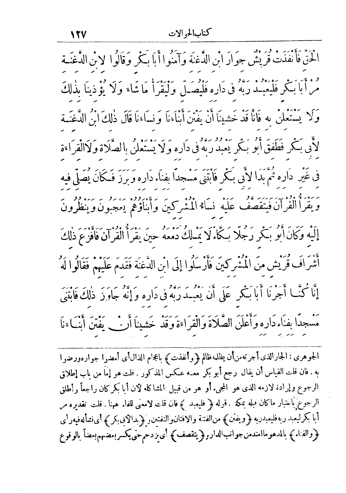 الْحَقِّ وَأَنَا لَكَ جَارٌ فَارْجِعْ فَاعْبُدْ رَبَّكَ بِبِلَادِكَ فَارْتَحَلَ ابْنُ الدَّغِنَةِ فَرَجَعَ مَعَ أَبِي بَكْرٍ فَطَافَ فِي أَشْرَافِ كُفَّارِ قُرَيْشٍ فَقَالَ لَهُمْ إِنَّ أَبَا بَكْرٍ لَا يَخْرُجُ مِثْلُهُ وَلَا يُخْرَجُ أَتُخْرِجُونَ رَجُلًا يُكْسِبُ الْمَعْدُومَ وَيَصِلُ الرَّحِمَ وَيَحْمِلُ الْكَلَّ وَيَقْرِي الضَّيْفَ وَيُعِينُ عَلَى نَوَائِبِ الْحَقِّ فَأَنْفَذَتْ قُرَيْشٌ جِوَارَ ابْنِ الدَّغِنَةِ وَآمَنُوا أَبَا بَكْرٍ وَقَالُوا لِابْنِ الدَّغِنَةِ مُرْ أَبَا بَكْرٍ فَلْيَعْبُدْ رَبَّهُ فِي دَارِهِ فَلْيُصَلِّ وَلْيَقْرَا مَا شَاءَ وَلَا يُؤْذِينَا بِذَلِكَ وَلَا يَسْتَعْلِنْ بِهِ فَإِنَّا قَدْ خَشِينَا أَنْ يَفْتِنَ أَبْنَاءَنَا وَنِسَاءَنَا قَالَ ذَلِكَ ابْنُ الدَّغِنَةِ لِأَبِي بَكْرٍ فَطَفِقَ أَبُو بَكْرٍ يَعْبُدُ رَبَّهُ فِي دَارِهِ وَلَا يَسْتَعْلِنُ بِالصَّلَاةِ وَلَا الْقِرَاءَةِ فِي غَيْرِ دَارِهِ ثُمَّ بَدَا لِأَبِي بَكْرٍ فَابْتَنَى مَسْجِدًا بِفِنَاءِ دَارِهِ وَبَرَزَ فَكَانَ يُصَلِّي فِيهِ وَيَقْرَأُ الْقُرْآنَ فَيَتَقَصَّفُ عَلَيْهِ نِسَاءُ الْمُشْرِكِينَ وَأَبْنَاؤُهُمْ يَعْجَبُونَ وَيَنْظُرُونَ إِلَيْهِ وَكَانَ أَبُو بَكْرٍ رَجُلًا بَكَّاءً لَا يَمْلِكُ دَمْعَهُ حِينَ يَقْرَأُ الْقُرْآنَ فَأَفْزَعَ ذَلِكَ أَشْرَافَ قُرَيْشٍ مِنْ الْمُشْرِكِينَ فَأَرْسَلُوا إِلَى ابْنِ الدَّغِنَةِ فَقَدِمَ عَلَيْهِمْ فَقَالُوا لَهُ إِنَّا كُنَّا أَجَرْنَا أَبَا بَكْرٍ عَلَى أَنْ يَعْبُدَ رَبَّهُ فِي دَارِهِ وَإِنَّهُ جَاوَزَ ذَلِكَ فَابْتَنَى مَسْجِدًا بِفِنَاءِ دَارِهِ وَأَعْلَنَ الصَّلَاةَ وَالْقِرَاءَةَ وَقَدْ خَشِينَا أَنْ يَفْتِنَ أَبْنَاءَنَا