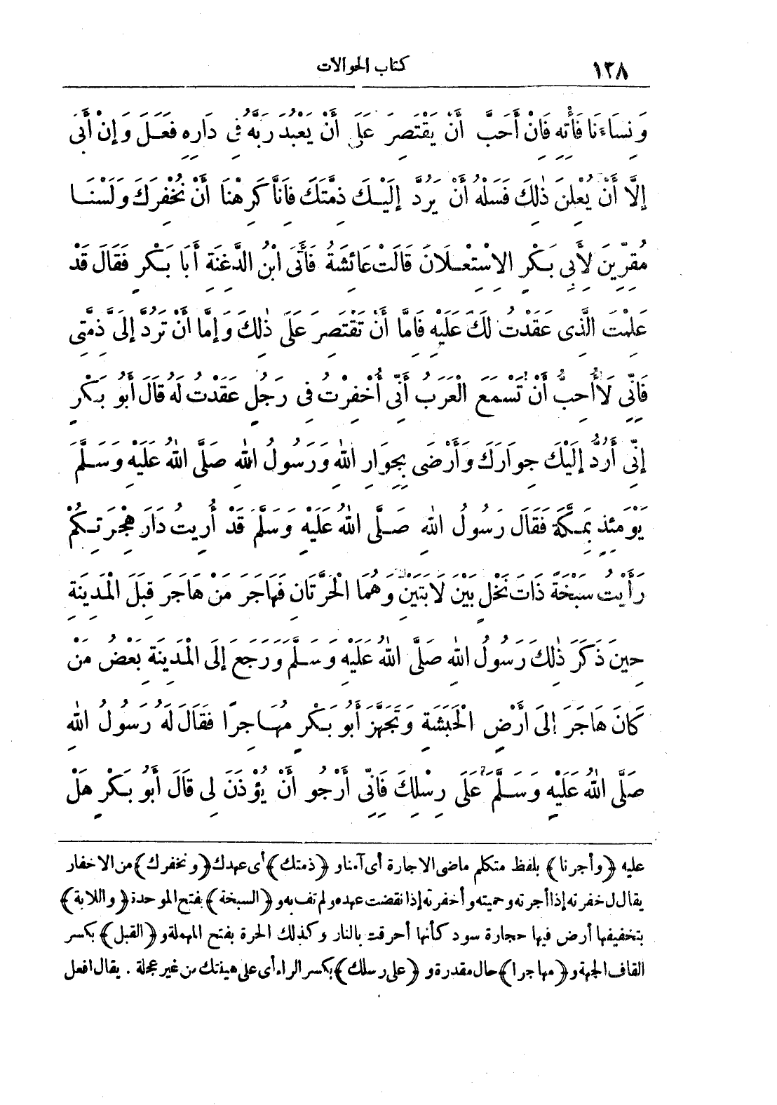 وَنِسَاءَنَا فَاتِهِ فَإِنْ أَحَبَّ أَنْ يَقْتَصِرَ عَلَى أَنْ يَعْبُدَ رَبَّهُ فِي دَارِهِ فَعَلَ وَإِنْ أَبَى إِلَّا أَنْ يُعْلِنَ ذَلِكَ فَسَلْهُ أَنْ يَرُدَّ إِلَيْكَ ذِمَّتَكَ فَإِنَّا كَرِهْنَا أَنْ نُخْفِرَكَ وَلَسْنَا مُقِرِّينَ لِأَبِي بَكْرٍ الِاسْتِعْلَانَ قَالَتْ عَائِشَةُ فَأَتَى ابْنُ الدَّغِنَةِ أَبَا بَكْرٍ فَقَالَ قَدْ عَلِمْتَ الَّذِي عَقَدْتُ لَكَ عَلَيْهِ فَإِمَّا أَنْ تَقْتَصِرَ عَلَى ذَلِكَ وَإِمَّا أَنْ تَرُدَّ إِلَيَّ ذِمَّتِي فَإِنِّي لَا أُحِبُّ أَنْ تَسْمَعَ الْعَرَبُ أَنِّي أُخْفِرْتُ فِي رَجُلٍ عَقَدْتُ لَهُ قَالَ أَبُو بَكْرٍ إِنِّي أَرُدُّ إِلَيْكَ جِوَارَكَ وَأَرْضَى بِجِوَارِ اللَّهِ وَرَسُولُ اللَّهِ صَلَّى اللَّهُ عَلَيْهِ وَسَلَّمَ يَوْمَئِذٍ بِمَكَّةَ فَقَالَ رَسُولُ اللَّهِ صَلَّى اللَّهُ عَلَيْهِ وَسَلَّمَ قَدْ أُرِيتُ دَارَ هِجْرَتِكُمْ رَأَيْتُ سَبْخَةً ذَاتَ نَخْلٍ بَيْنَ لَابَتَيْنِ وَهُمَا الْحَرَّتَانِ فَهَاجَرَ مَنْ هَاجَرَ قِبَلَ الْمَدِينَةِ حِينَ ذَكَرَ ذَلِكَ رَسُولُ اللَّهِ صَلَّى اللَّهُ عَلَيْهِ وَسَلَّمَ وَرَجَعَ إِلَى الْمَدِينَةِ بَعْضُ مَنْ كَانَ هَاجَرَ إِلَى أَرْضِ الْحَبَشَةِ وَتَجَهَّزَ أَبُو بَكْرٍ مُهَاجِرًا فَقَالَ لَهُ رَسُولُ اللَّهِ صَلَّى اللَّهُ عَلَيْهِ وَسَلَّمَ عَلَى رِسْلِكَ فَإِنِّي أَرْجُو أَنْ يُؤْذَنَ لِي قَالَ أَبُو بَكْرٍ هَلْ