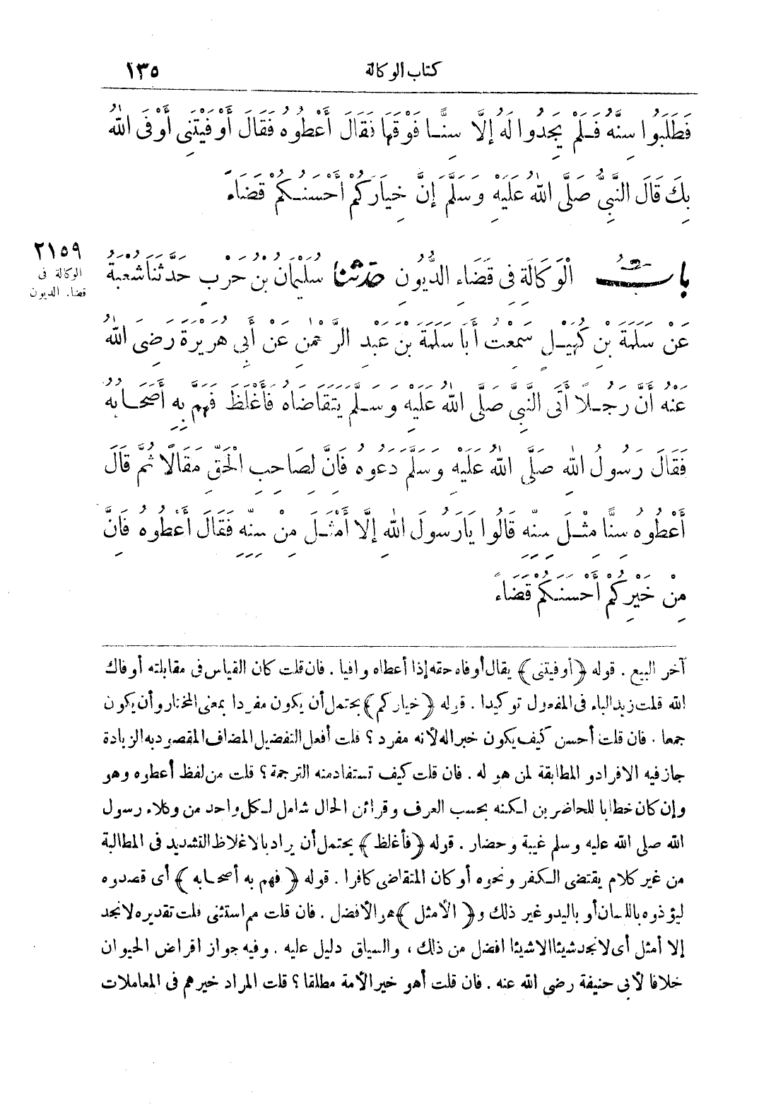 2159 - حَدَّثَنَا سُلَيْمَانُ بْنُ حَرْبٍ حَدَّثَنَا شُعْبَةُ عَنْ سَلَمَةَ بْنِ كُهَيْلٍ سَمِعْتُ أَبَا سَلَمَةَ بْنَ عَبْدِ الرَّحْمَنِ عَنْ أَبِي هُرَيْرَةَ رَضِيَ اللَّهُ عَنْهُ أَنَّ رَجُلًا أَتَى النَّبِيَّ صَلَّى اللَّهُ عَلَيْهِ وَسَلَّمَ يَتَقَاضَاهُ فَأَغْلَظَ فَهَمَّ بِهِ أَصْحَابُهُ فَقَالَ رَسُولُ اللَّهِ صَلَّى اللَّهُ عَلَيْهِ وَسَلَّمَ دَعُوهُ فَإِنَّ لِصَاحِبِ الْحَقِّ مَقَالًا ثُمَّ قَالَ أَعْطُوهُ سِنًّا مِثْلَ سِنِّهِ قَالُوا يَا رَسُولَ اللَّهِ إِلَّا أَمْثَلَ مِنْ سِنِّهِ فَقَالَ أَعْطُوهُ فَإِنَّ مِنْ خَيْرِكُمْ أَحْسَنَكُمْ قَضَاءً