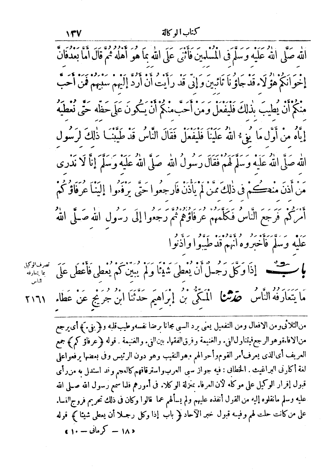 من الثلاثي ومن الأفعال ومن التفعيل يعني يرد السبي مجانا برضا نفسه وطيب قلبه و ((يفيء)) أي يرجع من الإفاءة وهو الرجع فيتناول الفيء والغنيمة وفرق الفقهاء بين الفيء والغنيمة. قوله ((عرفاؤكم)) جمع العريف أي الذي يعرف أمر القوم وأحوالهم وهو النقيب وهو دون الرئيس وفي بعضها يرفعوا على لغة أكلوني البراغيث. الخطابي: فيه جواز سبي العرب واسترقاقهم كالعجم وقد استدل به من رأى قبول إقرار الوكيل على موكله لأن العرفاء بمنزلة الوكلاء في أمورهم فلما سمع رسول اله صلى الله عليه وسلم ما نقلوه إليه من القول أنفذه عليهم ولم يسألهم عما قالوا وكان في ذلك تحريم فروج النساء على من كانت حلت لهم وفيه قبول خبر الآحاد ((باب إذا وكل رجلا أن يعطى شيئا)) قوله