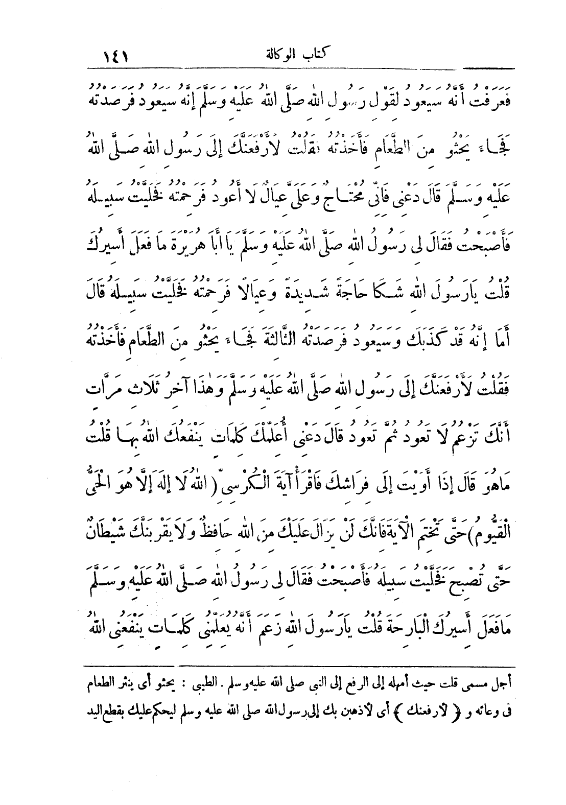 فَعَرَفْتُ أَنَّهُ سَيَعُودُ لِقَوْلِ رَسُولِ اللَّهِ صَلَّى اللَّهُ عَلَيْهِ وَسَلَّمَ إِنَّهُ سَيَعُودُ فَرَصَدْتُهُ فَجَاءَ يَحْثُو مِنْ الطَّعَامِ فَأَخَذْتُهُ فَقُلْتُ لَأَرْفَعَنَّكَ إِلَى رَسُولِ اللَّهِ صَلَّى اللَّهُ عَلَيْهِ وَسَلَّمَ قَالَ دَعْنِي فَإِنِّي مُحْتَاجٌ وَعَلَيَّ عِيَالٌ لَا أَعُودُ فَرَحِمْتُهُ فَخَلَّيْتُ سَبِيلَهُ فَأَصْبَحْتُ فَقَالَ لِي رَسُولُ اللَّهِ صَلَّى اللَّهُ عَلَيْهِ وَسَلَّمَ يَا أَبَا هُرَيْرَةَ مَا فَعَلَ أَسِيرُكَ قُلْتُ يَا رَسُولَ اللَّهِ شَكَا حَاجَةً شَدِيدَةً وَعِيَالًا فَرَحِمْتُهُ فَخَلَّيْتُ سَبِيلَهُ قَالَ أَمَا إِنَّهُ قَدْ كَذَبَكَ وَسَيَعُودُ فَرَصَدْتُهُ الثَّالِثَةَ فَجَاءَ يَحْثُو مِنْ الطَّعَامِ فَأَخَذْتُهُ فَقُلْتُ لَأَرْفَعَنَّكَ إِلَى رَسُولِ اللَّهِ وَهَذَا آخِرُ ثَلَاثِ مَرَّاتٍ أَنَّكَ تَزْعُمُ لَا تَعُودُ ثُمَّ تَعُودُ قَالَ دَعْنِي أُعَلِّمْكَ كَلِمَاتٍ يَنْفَعُكَ اللَّهُ بِهَا قُلْتُ مَا هُوَ قَالَ إِذَا أَوَيْتَ إِلَى فِرَاشِكَ فَاقْرَا آيَةَ الْكُرْسِيِّ {اللَّهُ لَا إِلَهَ إِلَّا هُوَ الْحَيُّ الْقَيُّومُ} حَتَّى تَخْتِمَ الْآيَةَ فَإِنَّكَ لَنْ يَزَالَ عَلَيْكَ مِنْ اللَّهِ حَافِظٌ وَلَا يَقْرَبَنَّكَ شَيْطَانٌ حَتَّى تُصْبِحَ فَخَلَّيْتُ سَبِيلَهُ فَأَصْبَحْتُ فَقَالَ لِي رَسُولُ اللَّهِ صَلَّى اللَّهُ عَلَيْهِ وَسَلَّمَ مَا فَعَلَ أَسِيرُكَ الْبَارِحَةَ قُلْتُ يَا رَسُولَ اللَّهِ زَعَمَ أَنَّهُ يُعَلِّمُنِي كَلِمَاتٍ يَنْفَعُنِي اللَّهُ