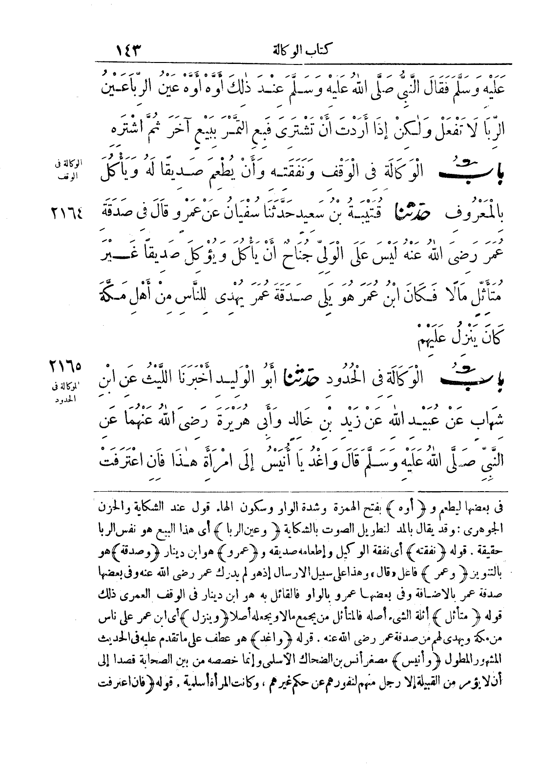 في بعضها ليطعم و ((أوه)) بفتح الهمزة وشدة الواو وسكون الهاء قول عند الشكاية والحزن الجوهري: وقد يقال بالمد لتطويل الصوت بالشكاية ((وعين الربا)) أي هذا البيع هو نفس الربا حقيقة. قوله (نفقته)) أي نفقة الوكيل وإطعامه صديقه و ((عمرو)) هو ابن دينار ((وصدقة)) هو بالتنوين ((وعمر)) فاعل >> قال << وهذا على سبيل الإرسال إذ هو لم يدرك عمر رضي الله عنه وفي بعضها صدقة عمر بالإضافة وفي بعضها عمرو بالواو فالقائل به هو ابن دينار في الوقف العمري ذلك قوله ((متأثل)) أثلة الشيء أصله فالمتأثل من يجمع مالا ويجعله أصلا ((وينزل)) أي ابن عمر على ناس من مكة ويهدي لهم من صدقة عمر رضي الله عنه. قوله ((واغد)) هو عطف على ما تقدم عليه في الحديث المشهور المطول ((وأنيس)) مصغر أنس بن الضحاك الأسلمى وإنما خصصه من بين الصحابة قصدا إلى أن لا يؤمر من القبيلة إلا رجل منهم لنفورهم عن حكم غيرهم، وكانت المرأة أسلمية، قوله ((فإن اعترفت