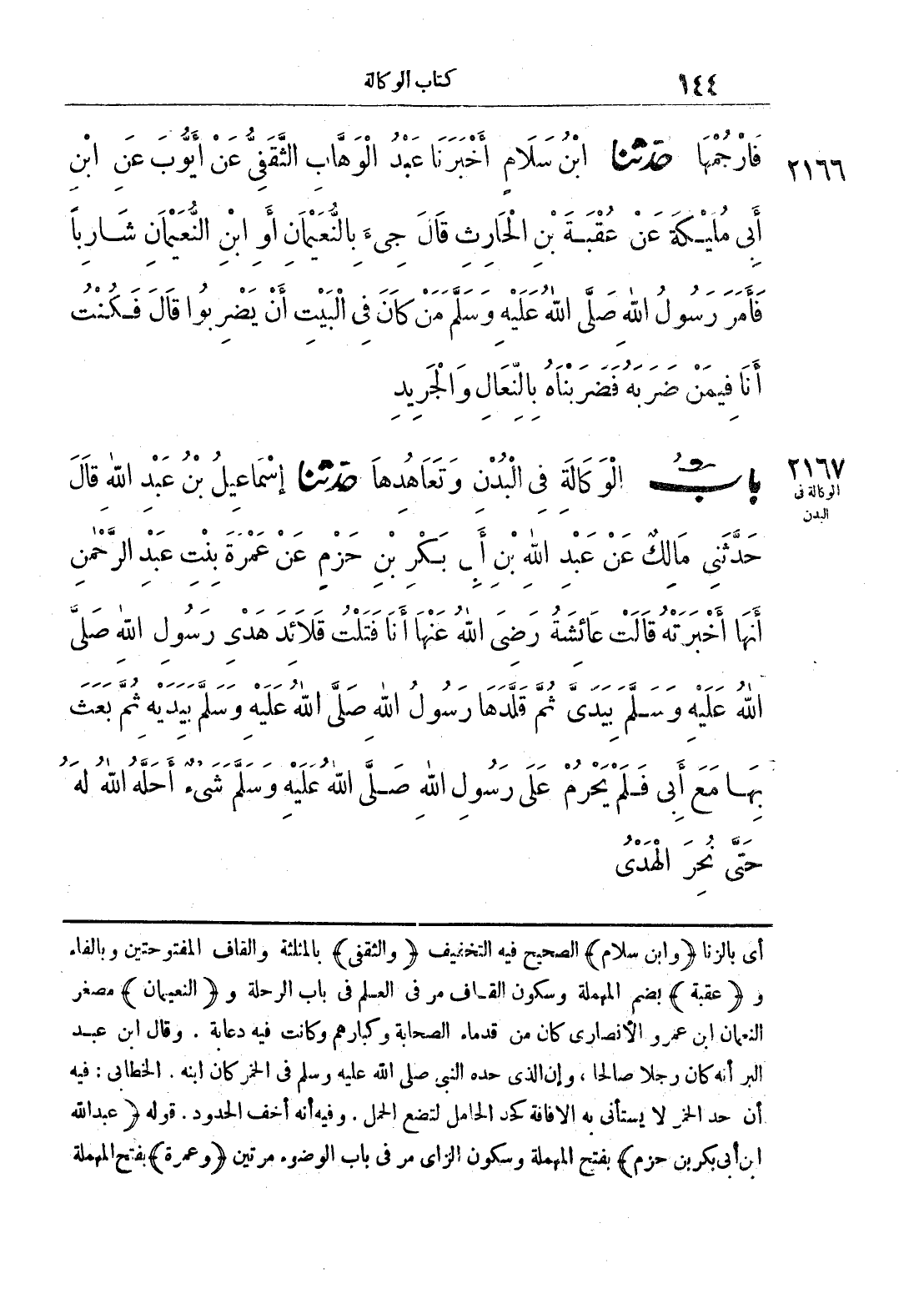 2167 - حَدَّثَنَا إِسْمَاعِيلُ بْنُ عَبْدِ اللَّهِ قَالَ حَدَّثَنِي مَالِكٌ عَنْ عَبْدِ اللَّهِ بْنِ أَبِي بَكْرِ بْنِ حَزْمٍ عَنْ عَمْرَةَ بِنْتِ عَبْدِ الرَّحْمَنِ أَنَّهَا أَخْبَرَتْهُ قَالَتْ عَائِشَةُ رَضِيَ اللَّهُ عَنْهَا أَنَا فَتَلْتُ قَلَائِدَ هَدْيِ رَسُولِ اللَّهِ صَلَّى اللَّهُ عَلَيْهِ وَسَلَّمَ بِيَدَيَّ ثُمَّ قَلَّدَهَا رَسُولُ اللَّهِ صَلَّى اللَّهُ عَلَيْهِ وَسَلَّمَ بِيَدَيْهِ ثُمَّ بَعَثَ بِهَا مَعَ أَبِي فَلَمْ يَحْرُمْ عَلَى رَسُولِ اللَّهِ صَلَّى اللَّهُ عَلَيْهِ وَسَلَّمَ شَيْءٌ أَحَلَّهُ اللَّهُ لَهُ حَتَّى نُحِرَ الْهَدْيُ