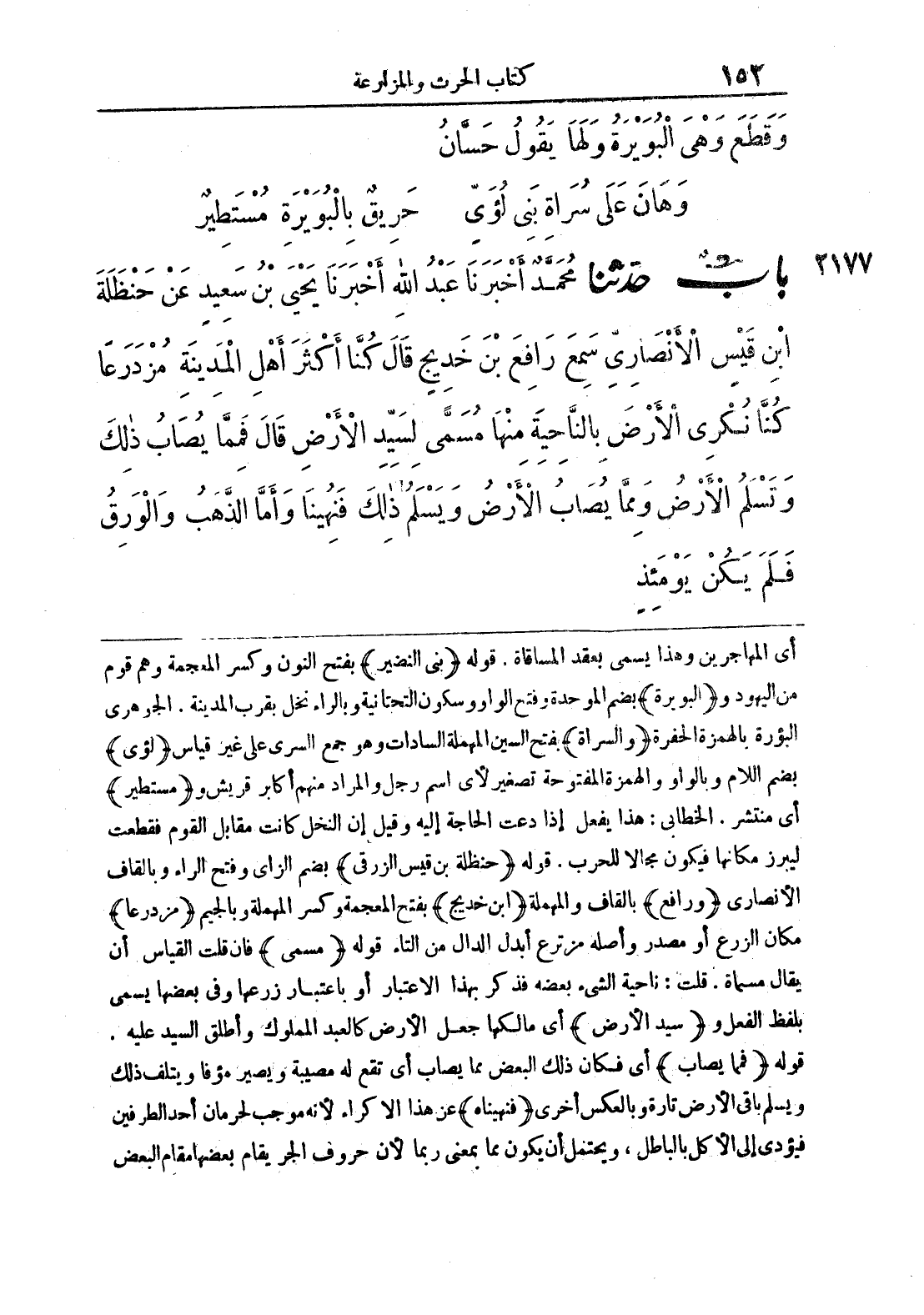 أي المهاجرين وهذا يسمى بعقد المساقاة , قوله ((بني النضير)) بفتح النون وكسر المعجمة وهم قوم من اليهود و ((البويرة)) بضم الموحدة وفتح الواو وسكون التحتانية وبالراء نخل بقرب المدينة. الجوهري البؤرة بالهمزة الحفرة ((والسراة)) بفتح السين المهملة السادات وهو جمع السري على غير قياس ((لؤي)) بضم اللام وبالواو والهمزة المفتوحة تصغير لأي اسم رجل والمراد منهم أكابر قريش و ((مستطير)) أي منتشر، الخطابي: هذا يفعل إذا دعت الحاجة إليه وقيل إن النخل كانت مقابل القوم فقطعت ليبرز مكانها فيكون مجالا للحرب. قوله ((حنظلة بن قيس الزرقى)) بضم الزاي وفتح الراء وبالقاف الأنصاري ((ورافع)) بالقاف والمهملة ((ابن خديج)) بفتح المعجمة وكسر المهملة وبالجيم ((مزدرعا)) مكان الزرع أو مصدر وأصله مزترع أبدل الدال من التاء قوله ((مسمى)) فان قلت القياس أن يقال مسماه , قلت: ناحية الشيء بعضه فذكر بهذا الاعتبار أو باعتبار زرعها وفي بعضها يسمى بلفظ الفعل و ((سيد الأرض)) أي مالكها جعل الأرض كالعبد المملوك وأطلق السيد عليه. قوله ((فمها يصاب)) أي فكان ذلك البعض مما يصاب أي تقع له مصيبة ويصير مؤفا ويتلف ذلك ويسلم باقي الأرض تارة وبالعكس أخرى ((فنهيناه)) عن هذا الاكراء لأنه موجب لحرمان أحد الطرفين فيؤدي إلى الأكل بالباطل، ويحتمل أن يكون مما بمعنى ربما لأن حروف الجر يقام بعضها مقام البعض