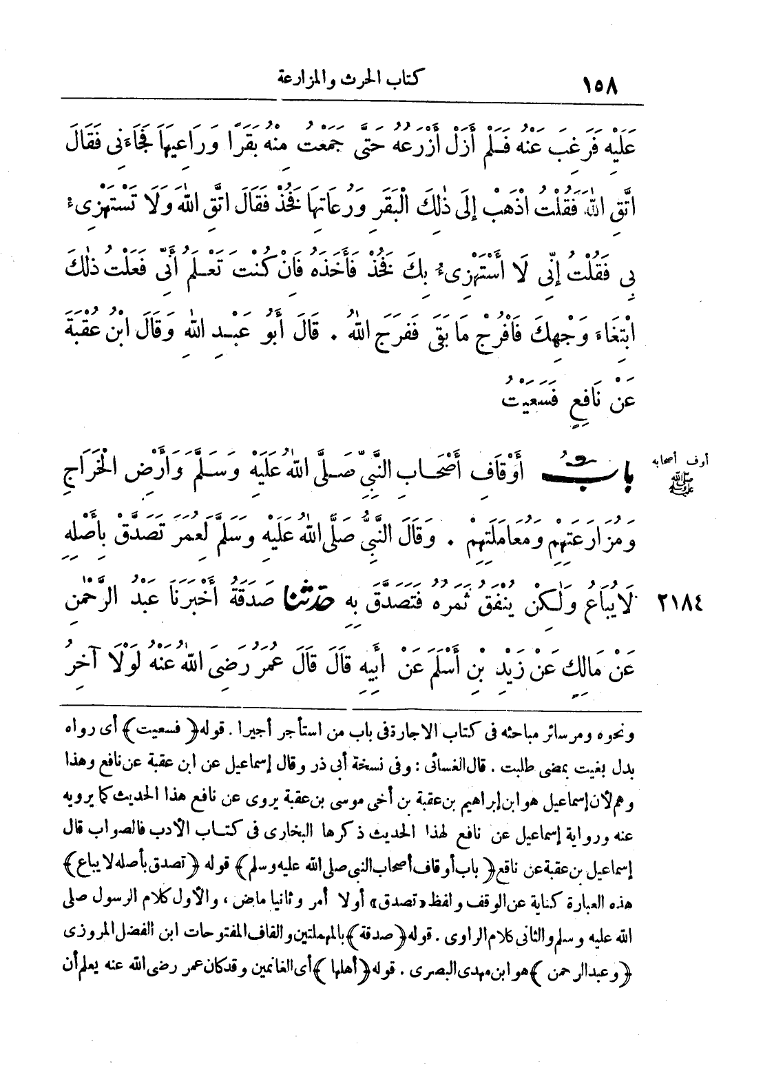 بَاب أَوْقَافِ أَصْحَابِ النَّبِيِّ صَلَّى اللَّهُ عَلَيْهِ وَسَلَّمَ وَأَرْضِ الْخَرَاجِ وَمُزَارَعَتِهِمْ وَمُعَامَلَتِهِمْ
