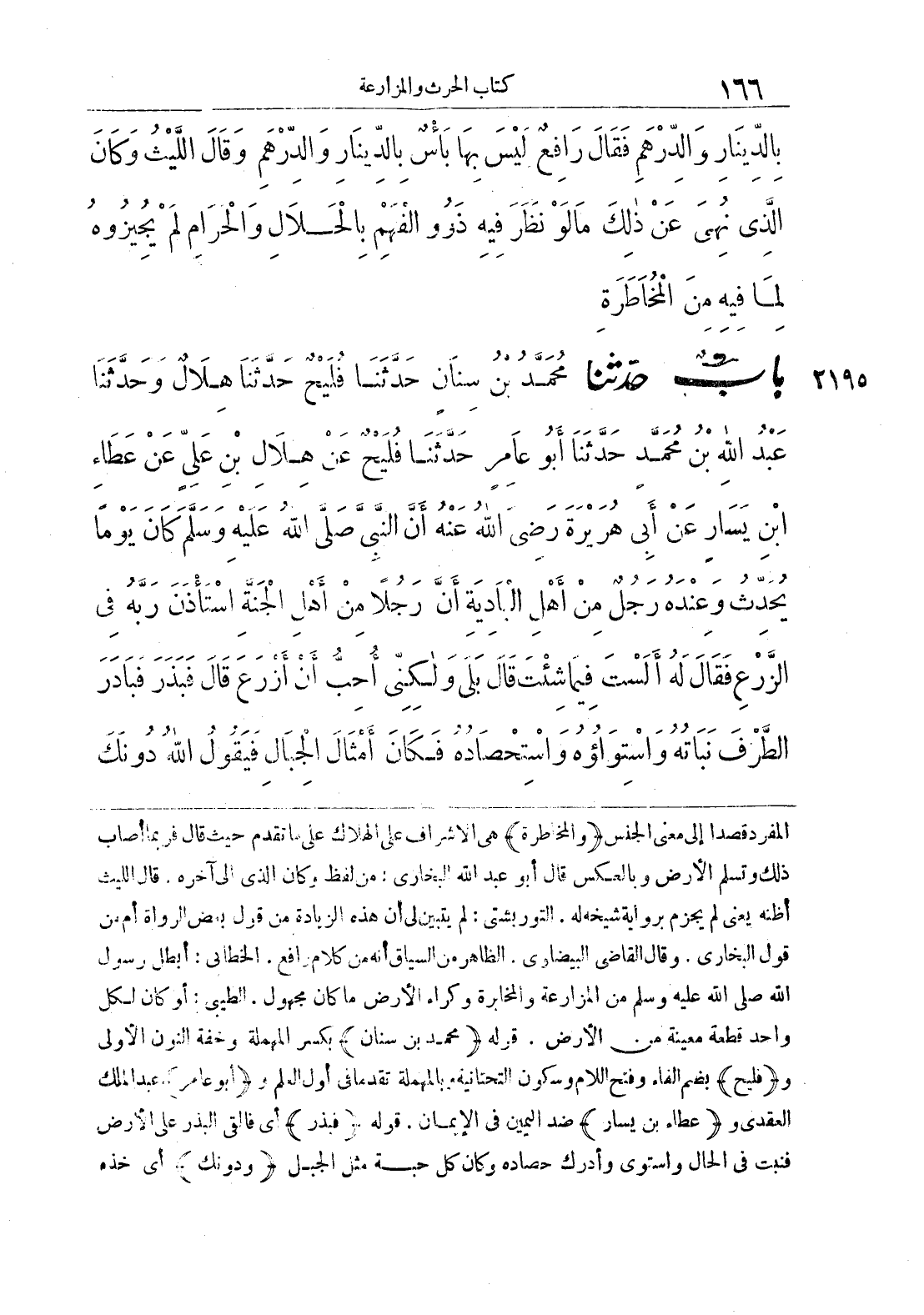 2195 - حَدَّثَنَا مُحَمَّدُ بْنُ سِنَانٍ حَدَّثَنَا فُلَيْحٌ حَدَّثَنَا هِلَالٌ وحَدَّثَنَا عَبْدُ اللَّهِ بْنُ مُحَمَّدٍ حَدَّثَنَا أَبُو عَامِرٍ حَدَّثَنَا فُلَيْحٌ عَنْ هِلَالِ بْنِ عَلِيٍّ عَنْ عَطَاءِ بْنِ يَسَارٍ عَنْ أَبِي هُرَيْرَةَ رَضِيَ اللَّهُ عَنْهُ أَنَّ النَّبِيَّ صَلَّى اللَّهُ عَلَيْهِ وَسَلَّمَ كَانَ يَوْمًا يُحَدِّثُ وَعِنْدَهُ رَجُلٌ مِنْ أَهْلِ الْبَادِيَةِ أَنَّ رَجُلًا مِنْ أَهْلِ الْجَنَّةِ اسْتَاذَنَ رَبَّهُ فِي الزَّرْعِ فَقَالَ لَهُ أَلَسْتَ فِيمَا شِئْتَ قَالَ بَلَى وَلَكِنِّي أُحِبُّ أَنْ أَزْرَعَ قَالَ فَبَذَرَ فَبَادَرَ الطَّرْفَ نَبَاتُهُ وَاسْتِوَاؤُهُ وَاسْتِحْصَادُهُ فَكَانَ أَمْثَالَ الْجِبَالِ فَيَقُولُ اللَّهُ دُونَكَ