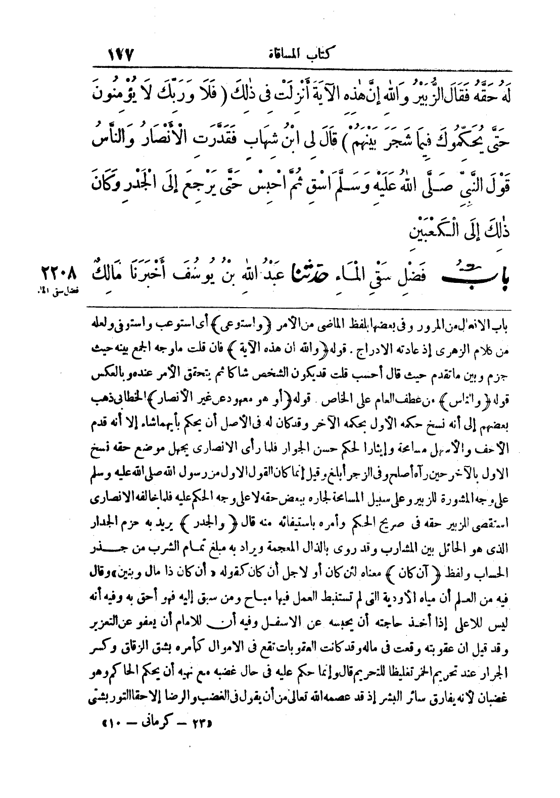 باب الإفعال من المرور وفي بعضها بلفظ الماضي من الأمر ((واستوعى)) أي استوعب واستوفى ولعله من كلام الزهري إذ عادته الإدراج. قوله ((والله إن هذه الآية)) فإن قلت ما وجه الجمع بينه حيث جزم وبين ما تقدم حيث قال أحسب قلت قد يكون الشخص شاكا ثم يتحقق الأمر عنده وبالعكس قوله ((والناس)) من عطف العام على الخاص. قوله ((أو هو معهود عن غير الأنصار)) الخطابي ذهب بعضهم إلى أنه نسخ حكمه الأول بحكمه الأخر وقد كان له في الأصل أن يحكم بأيهما شاء إلا أنه قدم الأخف والأسهل مسامحته وإيثارا لحكم حسن الجوار فلما رأى الأنصاري يجهل موضع حقه نسخ الأول بالأخر حين رآه أصلح وفي الزجر أبلغ وقيل إنما كان القول الأول من رسول الله صلى الله عليه وسلم على وجه المشورة للزبير وعلى سبيل المسامحة لجاره ببعض حقه لا على وجه الحكم عليه فلما خالفه الأنصاري استقصى الزبير حقه في صريح الحكم وأمره باستيفائه منه قال ((والجدر)) يريد به حزم الجدار الذي هو الحائل بين المشارب وقد روى بالذال المعجمة ويراد به مبلغ تمام الشرب من جذر الحساب ولفظ ((أن كان)) معناه لئن كان أو لأجل أن كان كقوله» أن كان ذا مال وبنين «وقال فيه من العلم أن مياه الأودية التي لم تستنبط العمل فيها مباح ومن سبق إليه فهو أحق به وفيه أنه ليس للأعلى إذا أخذ حاجته أن يحبسه عن الأسفل وفيه أن للإمام أن يعفو عن التعزير وقد قيل إن عقوبته وقعت في ماله وقد كانت العقوبات تقع في الأموال كأمره بشق الزقاق وكسر الجرار عند تحريم الخمر تغليظا للتحريم قال وإنما حكم عليه في حال غضبه مع نهيه أن يحكم الحاكم وهو غضبان لأنه يفارق سائر البشر إذ قد عصمه الله تعالى من أن يقول في الغضب والرضا إلا حقا التوربشتي