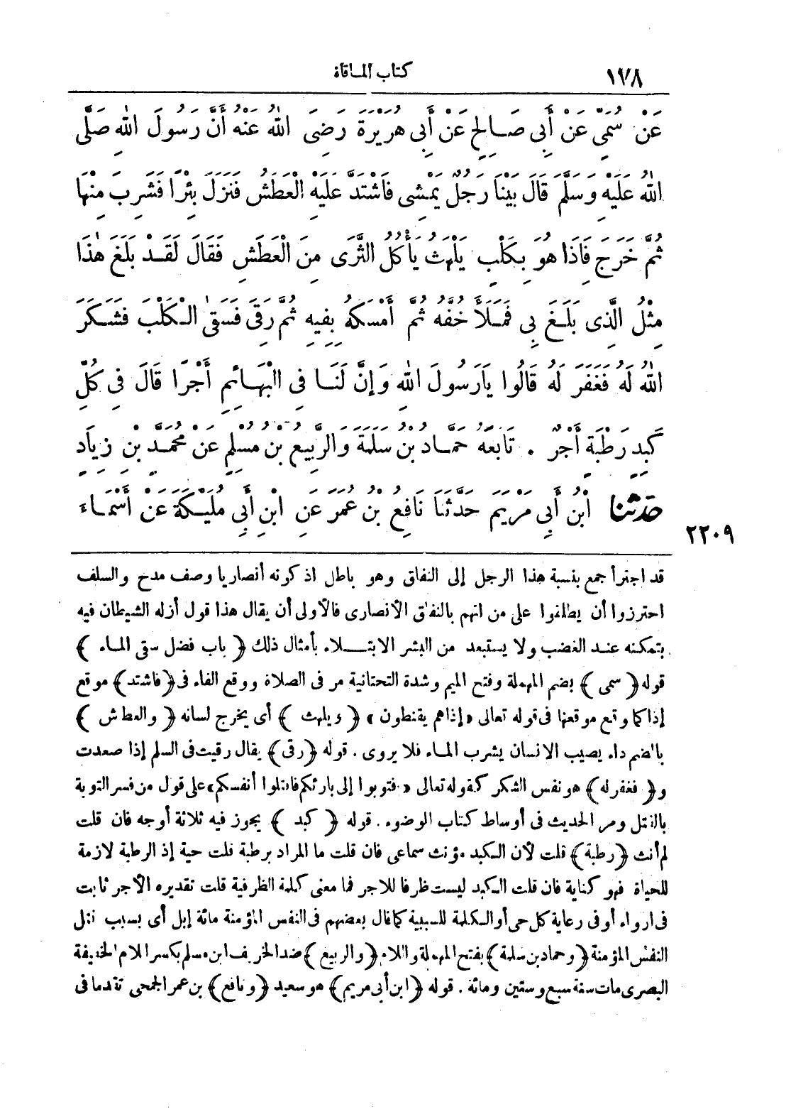 عَنْ سُمَيٍّ عَنْ أَبِي صَالِحٍ عَنْ أَبِي هُرَيْرَةَ رَضِيَ اللَّهُ عَنْهُ أَنَّ رَسُولَ اللَّهِ صَلَّى اللَّهُ عَلَيْهِ وَسَلَّمَ قَالَ بَيْنَا رَجُلٌ يَمْشِي فَاشْتَدَّ عَلَيْهِ الْعَطَشُ فَنَزَلَ بِئْرًا فَشَرِبَ مِنْهَا ثُمَّ خَرَجَ فَإِذَا هُوَ بِكَلْبٍ يَلْهَثُ يَاكُلُ الثَّرَى مِنْ الْعَطَشِ فَقَالَ لَقَدْ بَلَغَ هَذَا مِثْلُ الَّذِي بَلَغَ بِي فَمَلَأَ خُفَّهُ ثُمَّ أَمْسَكَهُ بِفِيهِ ثُمَّ رَقِيَ فَسَقَى الْكَلْبَ فَشَكَرَ اللَّهُ لَهُ فَغَفَرَ لَهُ قَالُوا يَا رَسُولَ اللَّهِ وَإِنَّ لَنَا فِي الْبَهَائِمِ أَجْرًا قَالَ فِي كُلِّ كَبِدٍ رَطْبَةٍ أَجْرٌ تَابَعَهُ حَمَّادُ بْنُ سَلَمَةَ وَالرَّبِيعُ بْنُ مُسْلِمٍ عَنْ مُحَمَّدِ بْنِ زِيَادٍ