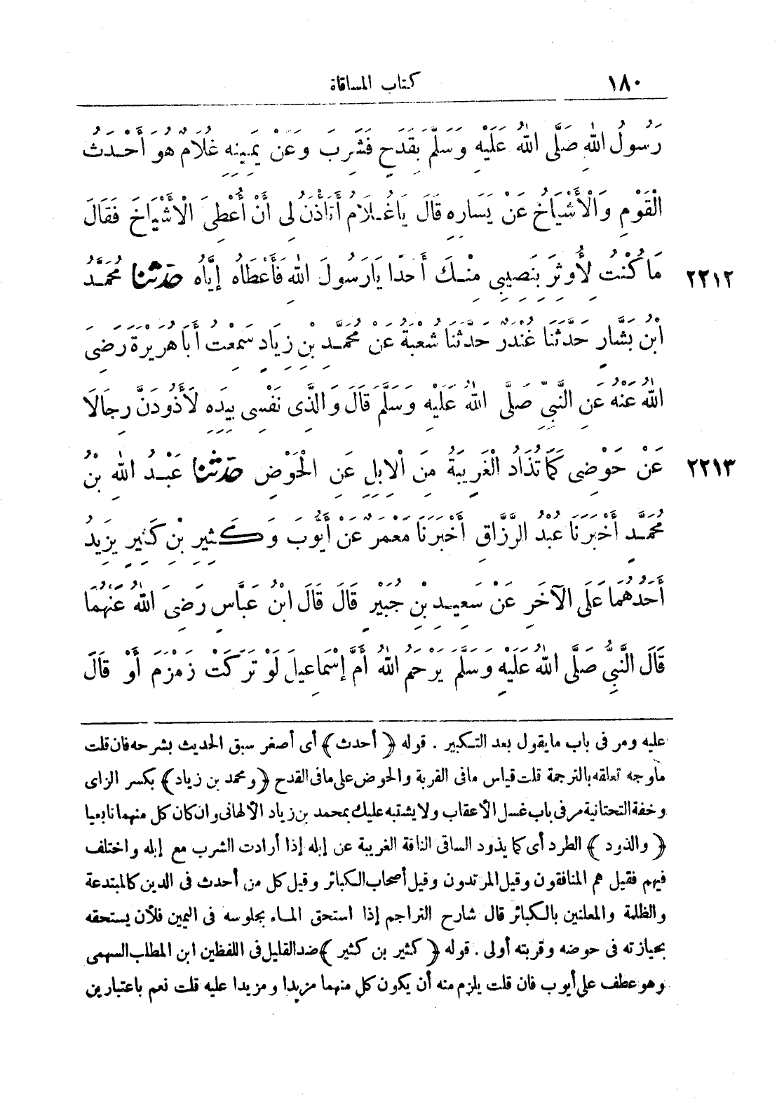 عليه ومر في باب ما يقول بعد التكبير. قوله ((أحدث)) أي أصغر سبق الحديث بشرحه فان قلت ما وجه تعلقه بالترجمة قلت قياس ما في القربة والحوض على ما في القدح ((ومحمد بن زياد)) بكسر الزاي وخفة التحتانية مر في باب غسل الأعقاب ولا يشتبه عليك بمحمد بن زياد الألهاني وإن كان كل منهما تابعيا ((والذود)) الطرد أي كما يذود الساقي الناقة الغريبة عن إبله إذا أرادت الشرب مع إبله واختلفت فيهم فقيل هم المنافقون وقيل المرتدون وقيل أصحاب الكبائر وقيل كل من أحدث في الدين كالمبتدعة والظلمة والمعلنين بالكبائر قال شارح التراجم إذا استحق الماء بجلوسه في اليمين فلأن يستحقه بحيازته في حوضه وقربته أولى. قوله ((كثير بن كثير)) ضد القليل قي اللفظين ابن المطلب السهمي وهو عطف على أيوب فان قلت يلزم منه أن يكون كل منهما مزيدا ومزيدا عليه قلت نعم باعتبارين
