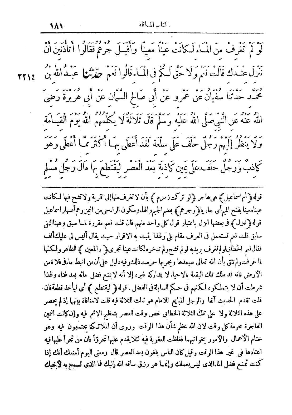 قوله ((أم إسماعيل)) هي هاجر ((لو تركت زمزم)) بأن لا تغرف منها إلى القربة ولا تشح فيها لكانت عينا معينا بفتح الميم أي جاريا ((وجرهم)) بضم الجيم والهاء وسكون الراء حي من اليمن وهم أصهار إسماعيل قوله ((ننزل)) في بعضها انزل باعتبار قول كل واحد منهم فإن قلت نعم مقررة لما سبق وههنا النفي سابق قلت نعم تستعمل في العرف مقام بلى ولهذا يثبت به الإقرار حيث يقال أليس لي عليك ألف فقال نعم الخطابي لو لم تعرف يريد به لو لم تشح ولم تدخره لكانت عينا تجري ((والمعين)) الظاهر ولكنها لما غرفت ولم تثق بأن الله تعالى سيمدها ويجريها حرمت ذلك وفيه دليل على أن من أنبط ماء في فلاة من الأرض فانه قد ملك تلك البقعة بالإحياء لا يشاركه غيره إلا أنه لا يمنع فضل مائه بعد غناه ولهذا شرطت أن لا يتملكوه لكنهم في حكم السابلة في الفضل. قوله ((ليقتطع)) أي ليأخذ قطعة فان قلت تقدم الحديث أنفا والرجل المبايع للإمام هو ثلث الثلاثة فيه قلت لا منافاة بينهما إذ لم يحصر على هذه الثلاثة ولا على تلك الثلاثة الخطابي خص وقت العصر بتعظيم الإثم فيه وإن كانت اليمين الفاجر ة محرمة كل وقت لأن الله عظم شأن هذا الوقت وروى أن الملائكة يجتمعون فيه وهو ختام الأعمال والأمور بخواتيمهما فغلظت العقوبة فيه لئلا يقدم عليها تجرؤا فان من تجرأ عليها فيه اعتادها في غير هذا الوقت وقيل كان الناس يلغون بعد العصر قال ومعنى اليوم أمنعك أنك إذا كنت تمنع فضل الماء الذي ليس بعملك وإنما هو رزق ساقه الله إليك فما الذي تسمح به لأخيك