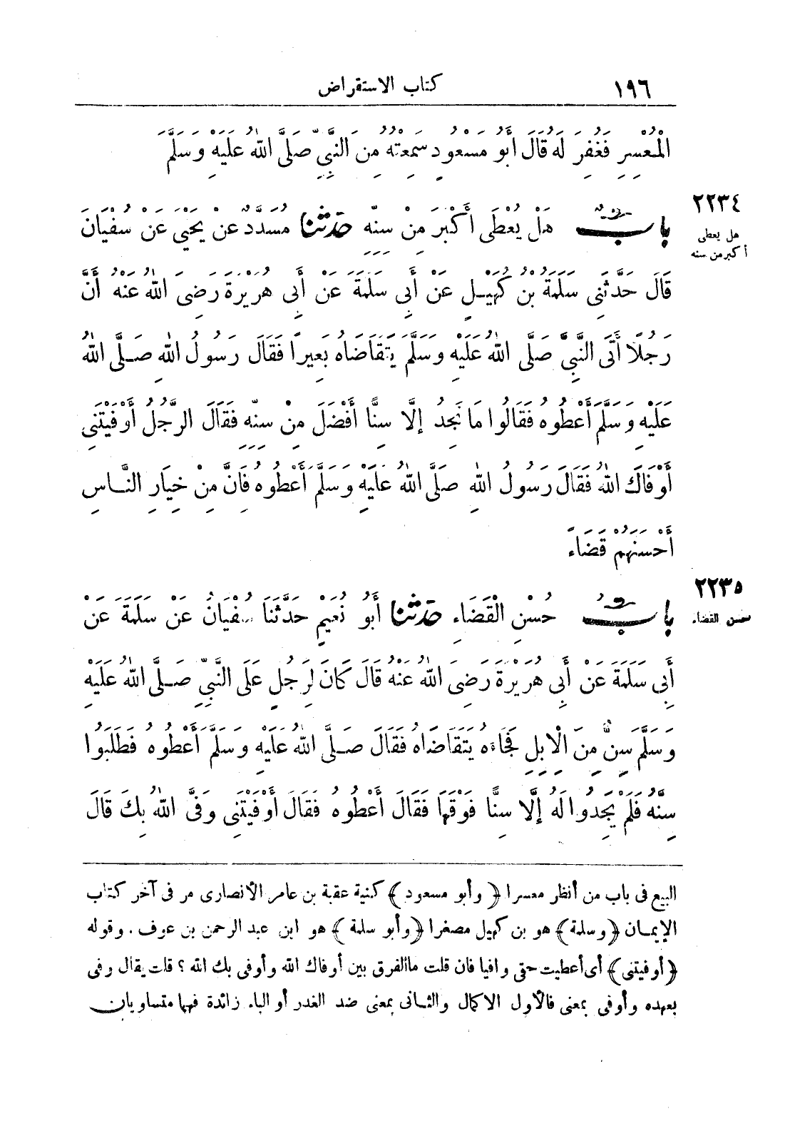 كَانَ لِرَجُلٍ عَلَى النَّبِيِّ صَلَّى اللَّهُ عَلَيْهِ وَسَلَّمَ سِنٌّ مِنْ الْإِبِلِ فَجَاءَهُ يَتَقَاضَاهُ فَقَالَ صَلَّى اللَّهُ عَلَيْهِ وَسَلَّمَ أَعْطُوهُ فَطَلَبُوا سِنَّهُ فَلَمْ يَجِدُوا لَهُ إِلَّا سِنًّا فَوْقَهَا فَقَالَ أَعْطُوهُ فَقَالَ أَوْفَيْتَنِي وَفَى اللَّهُ بِكَ قَالَ