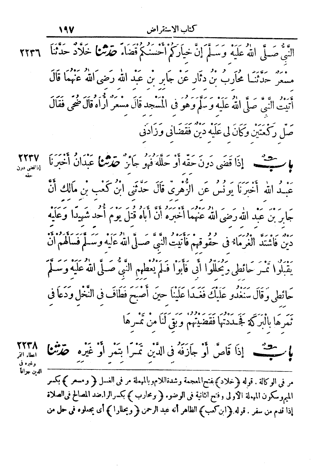 2236 - حَدَّثَنَا خَلَّادُ بْنُ يَحْيَى حَدَّثَنَا مِسْعَرٌ حَدَّثَنَا مُحَارِبُ بْنُ دِثَارٍ عَنْ جَابِرِ بْنِ عَبْدِ اللَّهِ رَضِيَ اللَّهُ عَنْهُمَا قَالَ