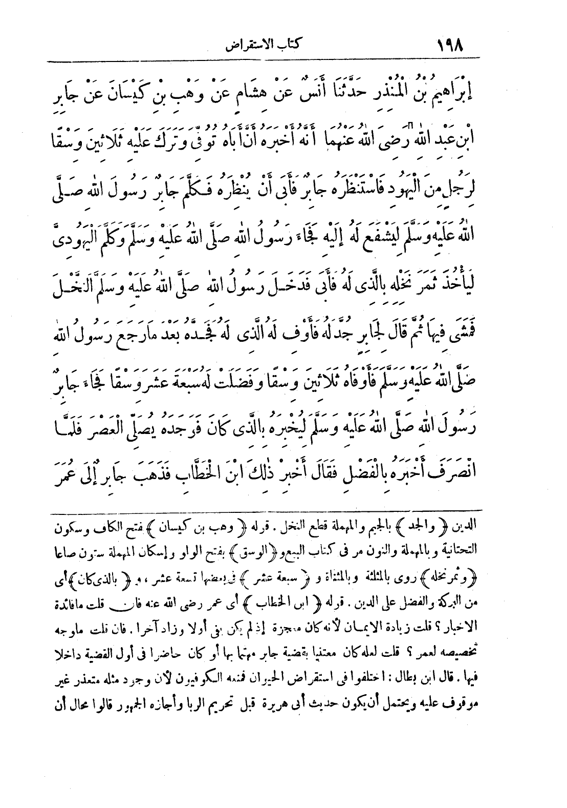 الدين ((والجد)) بالجيم والمهملة قطع النخل. قوله ((وهب بن كيسان)) بفتح الكاف وسكون التحتانية وبالمهملة والنون مر في كتاب البيع و ((الوسق)) بفتح الواو وإسكان المهملة ستون صاعا ((وثمر نخله)) وروى بالمثلثة وبالمثناة و ((سبعة عشر)) في بعضها تسعة عشر، و ((بالذي كان)) أي من البركة والفضل على الدين. قوله ((ابن الخطاب) أي عمر رضي الله عنه فان قلت ما فائدة الإخبار؟ قلت زيادة الإيمان لأنه كان معجزة إذ لم يكن بقى أولا وزاد أخرا. فان قلت ما وجه تخصيصه لعمر؟ قلت لعله كان معتنيا بقضية جابر مهتما بها أو كان حاضرا في أول القضية داخلا فيها. قال ابن بطال: اختلفوا في استقراض الحيوان فمنعه الكوفيون لأن وجود مثله متعذر غير موقوف عليه ويحتمل أن يكون حديث أبي هريرة قبل تحريم الربا وأجازه الجمهور قالوا محال أن