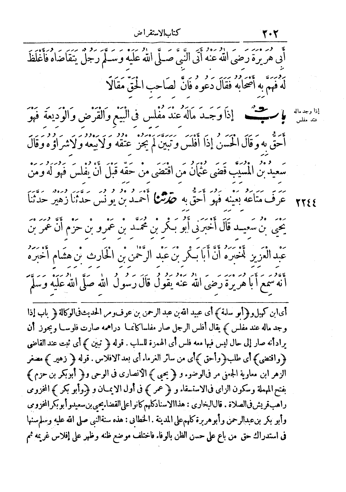 أي ابن كهيل و ((أبو سلمة)) أي عبيد الله بن عبد الرحمن بن عوف ومر الحديث في الوكالة ((باب إذا وجد ماله عند مفلس)) يقال أفلس الرجل صار مفلسا كأنما دراهمه صارت فلوسا ويجوز أن يراد أنه صار إلى حال ليس فيها معه فلس أي الهمزة للسلب , قوله ((تبين)) أي ثبت عند القاضي ((واقتضى)) أي طلب ((وأحق)) أي من سائر الغرماء أي بعد الإفلاس. قوله ((زهير)) مصغر الزهر ابن معاوية الجعفى مر في الوضوء و ((يحي)) الأنصاري في الوحي و ((أبو بكر بن حزم)) بفتح المهملة وسكون الزاي في الاستسقاء و ((عمر)) في أول الإيمان و ((وأبو بكر)) المخزومي راهب قريش في الصلاة. قال البخاري: هذا الإسناد كلهم كانوا على القضاء يحي بن سعيد وأبو بكر المخزومي وأبو بكر بن عبد الرحمن وأبو هريرة كلهم على المدينة. الخطابي: هذه سنة النبي صلى الله عليه وسلم سنها في استدراك حق من باع على حسن الظن بالوفاء فاختلف موضع ظنه وظهر على إفلاس غريمه ثم