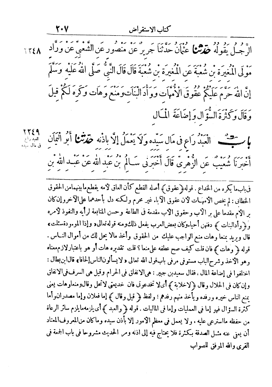 في باب ما يكره من الخداع. قوله ((عقوق)) أصله القطع كأن العاق لأمه يقطع ما بينهما من الحقوق الخطابي: لم يخص الأمهات لأن عقوق الآباء غير محرم ولكنه دل بأحدهما على الأخر وإن كان بر الأم مقدما على بر الأب وحقوق الأب مقدمة في الطاعة وحسن المتابعة لرأيه والنفوذ لأمره و ((وأد البنات)) دفنهن أحياء وكان بعض العرب يفعل ذلك ومنه قوله تعالى» وإذا الموءودة سئلت «قال ويريد بمنعا وهات منع الواجب عليك من الحقوق وأخد مالا يحل لك من أموال الناس، قوله ((وهات)) فإن قلت كيف صح عطفه على منعا؟ قلت تقديره هات أو هو باعتبار لازم معناه وهو الأخذ وشرح الباب مستوفى مر في باب قول الله تعالى» لا يسألون الناس إلحافا «قال ابن بطال: اختلفوا في إضاعة المال، فقال سعيد بن جبير: هي الإنفاق في الحرام وقيل هي السرف في الإنفاق وإن كان في الحلال وقال ((لا خلابة)) أي لا تخدعوني فان خديعتي لا تحل وقال ومنعا وهات يعني يمنع الناس خيره ورفده ويأخذ منهم رفدهم؛ ولفظ ((قيل وقال)) إما فعلان وإما مصدران وأما كثرة السؤال فهو إما في العمليات وإما في الماليات. قوله ((والعبد)) أي يلزمه ما يلزم سائر الرعاة من حفظه ما استرعى عليه، ولا يعمل في معظم الأمور إلا بأذن سيده وما كان من المعروف المعتاد أن يعفي عنه مثل الصدقة بكثرة فلا يحتاج فيه إلى إذنه ومر الحديث مشروحا في باب الجمعة في القرى والله الموفق للصواب