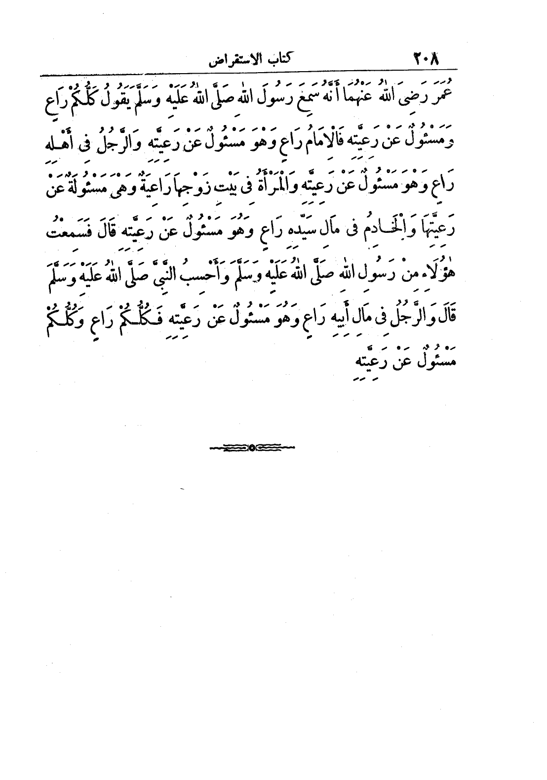 عُمَرَ رَضِيَ اللَّهُ عَنْهُمَا أَنَّهُ سَمِعَ رَسُولَ اللَّهِ صَلَّى اللَّهُ عَلَيْهِ وَسَلَّمَ يَقُولُ كُلُّكُمْ رَاعٍ وَمَسْئُولٌ عَنْ رَعِيَّتِهِ فَالْإِمَامُ رَاعٍ وَهُوَ مَسْئُولٌ عَنْ رَعِيَّتِهِ وَالرَّجُلُ فِي أَهْلِهِ رَاعٍ وَهُوَ مَسْئُولٌ عَنْ رَعِيَّتِهِ وَالْمَرْأَةُ فِي بَيْتِ زَوْجِهَا رَاعِيَةٌ وَهِيَ مَسْئُولَةٌ عَنْ رَعِيَّتِهَا وَالْخَادِمُ فِي مَالِ سَيِّدِهِ رَاعٍ وَهُوَ مَسْئُولٌ عَنْ رَعِيَّتِهِ قَالَ فَسَمِعْتُ هَؤُلَاءِ مِنْ رَسُولِ اللَّهِ صَلَّى اللَّهُ عَلَيْهِ وَسَلَّمَ وَأَحْسِبُ النَّبِيَّ صَلَّى اللَّهُ عَلَيْهِ وَسَلَّمَ قَالَ وَالرَّجُلُ فِي مَالِ أَبِيهِ رَاعٍ وَهُوَ مَسْئُولٌ عَنْ رَعِيَّتِهِ فَكُلُّكُمْ رَاعٍ وَكُلُّكُمْ مَسْئُولٌ عَنْ رَعِيَّتِهِ.