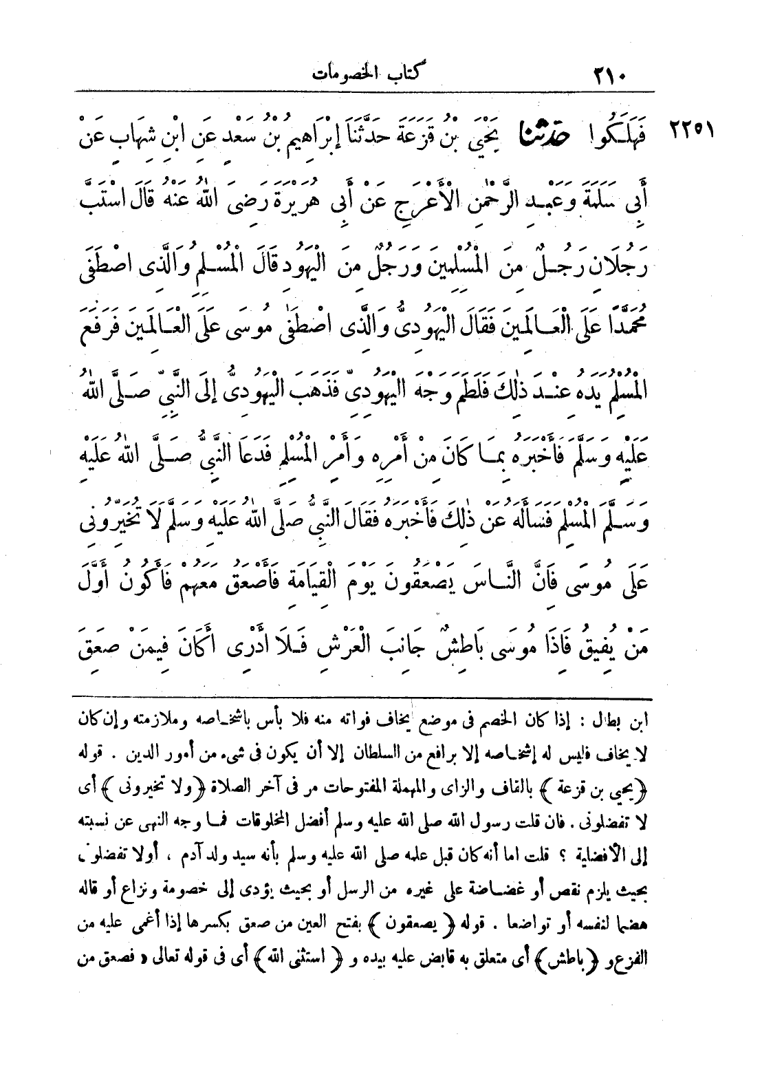 2251 - حَدَّثَنَا يَحْيَى بْنُ قَزَعَةَ حَدَّثَنَا إِبْرَاهِيمُ بْنُ سَعْدٍ عَنْ ابْنِ شِهَابٍ عَنْ أَبِي سَلَمَةَ وَعَبْدِ الرَّحْمَنِ الْأَعْرَجِ عَنْ أَبِي هُرَيْرَةَ رَضِيَ اللَّهُ عَنْهُ قَالَ اسْتَبَّ رَجُلَانِ رَجُلٌ مِنْ الْمُسْلِمِينَ وَرَجُلٌ مِنْ الْيَهُودِ قَالَ الْمُسْلِمُ وَالَّذِي اصْطَفَى مُحَمَّدًا عَلَى الْعَالَمِينَ فَقَالَ الْيَهُودِيُّ وَالَّذِي اصْطَفَى مُوسَى عَلَى الْعَالَمِينَ فَرَفَعَ الْمُسْلِمُ يَدَهُ عِنْدَ ذَلِكَ فَلَطَمَ وَجْهَ الْيَهُودِيِّ فَذَهَبَ الْيَهُودِيُّ إِلَى النَّبِيِّ صَلَّى اللَّهُ عَلَيْهِ وَسَلَّمَ فَأَخْبَرَهُ بِمَا كَانَ مِنْ أَمْرِهِ وَأَمْرِ الْمُسْلِمِ فَدَعَا النَّبِيُّ صَلَّى اللَّهُ عَلَيْهِ وَسَلَّمَ الْمُسْلِمَ فَسَأَلَهُ عَنْ ذَلِكَ فَأَخْبَرَهُ فَقَالَ النَّبِيُّ صَلَّى اللَّهُ عَلَيْهِ وَسَلَّمَ لَا تُخَيِّرُونِي عَلَى مُوسَى فَإِنَّ النَّاسَ يَصْعَقُونَ يَوْمَ الْقِيَامَةِ فَأَصْعَقُ مَعَهُمْ فَأَكُونُ أَوَّلَ مَنْ يُفِيقُ فَإِذَا مُوسَى بَاطِشٌ جَانِبَ الْعَرْشِ فَلَا أَدْرِي أَكَانَ فِيمَنْ صَعِقَ