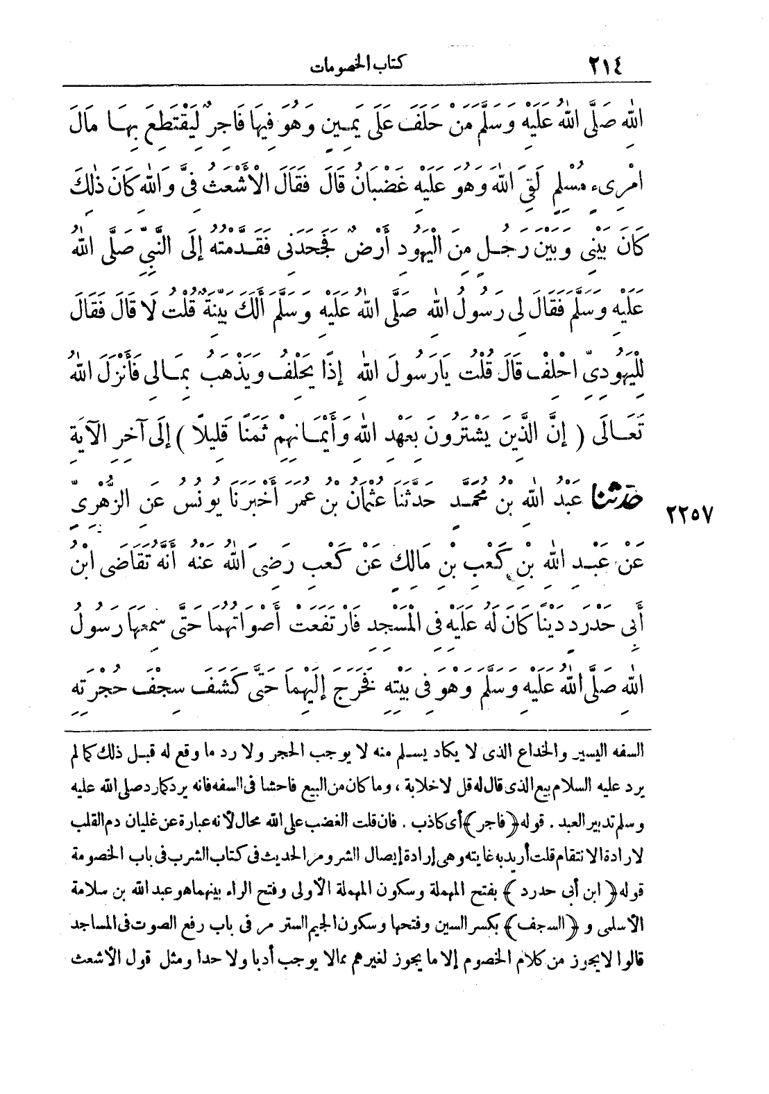 2257 - حَدَّثَنَا عَبْدُ اللَّهِ بْنُ مُحَمَّدٍ حَدَّثَنَا عُثْمَانُ بْنُ عُمَرَ أَخْبَرَنَا يُونُسُ عَنْ الزُّهْرِيِّ عَنْ عَبْدِ اللَّهِ بْنِ كَعْبِ بْنِ مَالِكٍ عَنْ كَعْبٍ رَضِيَ اللَّهُ عَنْهُ أَنَّهُ تَقَاضَى ابْنَ أَبِي حَدْرَدٍ دَيْنًا كَانَ لَهُ عَلَيْهِ فِي الْمَسْجِدِ فَارْتَفَعَتْ أَصْوَاتُهُمَا حَتَّى سَمِعَهَا رَسُولُ اللَّهِ صَلَّى اللَّهُ عَلَيْهِ وَسَلَّمَ وَهُوَ فِي بَيْتِهِ فَخَرَجَ إِلَيْهِمَا حَتَّى كَشَفَ سِجْفَ حُجْرَتِهِ