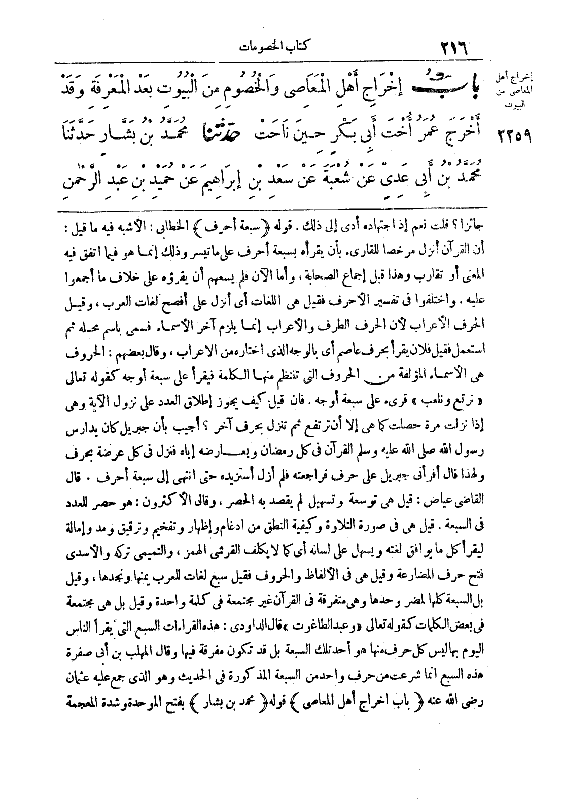 جائزا؟ قلت نعم إذا اجتهاده أدى إلى ذلك. قوله ((سبعة أحرف)) الخطابي: الأشبه فيه ما قيل: أن القرآن أنزل مرخصا للقارئ بأن يقرأه بسبعة أحرف على ما تيسر وذلك إنما هو فيما اتفق فيه المعنى أو تقارب وهذا قبل إجماع الصحابة، وأما الآن فلم يسعهم أن يقرؤه على خلاف ما أجمعوا عليه. واختلفوا في تفسير الأحرف فقيل هي اللغات أي أنزل على أفصح لغات العرب، وقيل الحرف الأعراب لأن الحرف الطرف والأعراب إنما يلزم أخر الأسماء فسمي باسم محله ثم استعمل فقيل فلان يقرأ بحرف عاصم أي بالوجه الذي اختاره من الأعراب، وقال بعضهم: الحروف هي الأسماء المؤلفة من الحروف التي تنتظم منها الكلمة فيقرأ على سبعة أوجه كقوله تعالى» نرتع ونلعب «قرئ على سبعة أوجه. فان قيل كيف يجوز إطلاق العدد على نزول الآية وهي إذا نزلت مرة حصلت كما هي إلا أن ترتفع ثم تنزل بحرف أخر؟ أجيب بأن جبريل كان يدارس رسول الله صلى الله عليه وسلم القران في كل رمضان ويعارضه إياه فنزل في كل عرضة بحرف ولهذا قال أقراني جبريل على حرف فراجعته فلم أزل أستزيده حتى انتهى إلى سبعة أحرف. قال القاضي عياض: قيل هي توسعة وتسهيل لم يقصد به الحصر، وقال الأكثرون: هو حصر للعدد في السبعة. قيل هي صورة التلاوة وكيفية النطق من إدغام وإظهار وتفخيم وترقيق ومد وإمالة ليقرأ كل ما يوافق لغته ويسهل على لسانه أي كما لا يكلف القرشي الهمز، والتميمي تركه والأسدى فتح حرف المضارعة وقيل هي في الألفاظ والحروف فقيل سبع لغات للعرب يمنها ونجدها، وقيل بل السبعة كلها لمضر وحدها وهي متفرقة في القران غير مجتمعة في كلمة واحدة وقيل بل هي مجتمعة في بعض الكلمات كقوله تعالى» وعبد الطاغوت «قال الداودي: هذه القراءات السبع التي يقرأ الناس اليوم بها ليس كل حرف منها هو أحد تلك السبعة بل قد تكون مفرقة فيها وقال المهلب بن أبي صفرة هذه السبع إنما شرعت من حرف واحد من السبعة المذكورة في الحديث وهو الذي جمع عليه عثمان رضي الله عنه ((باب إخراج أهل المعاصي)) قوله ((محمد بن بشار)) بفتح الموحدة وشدة المعجمة