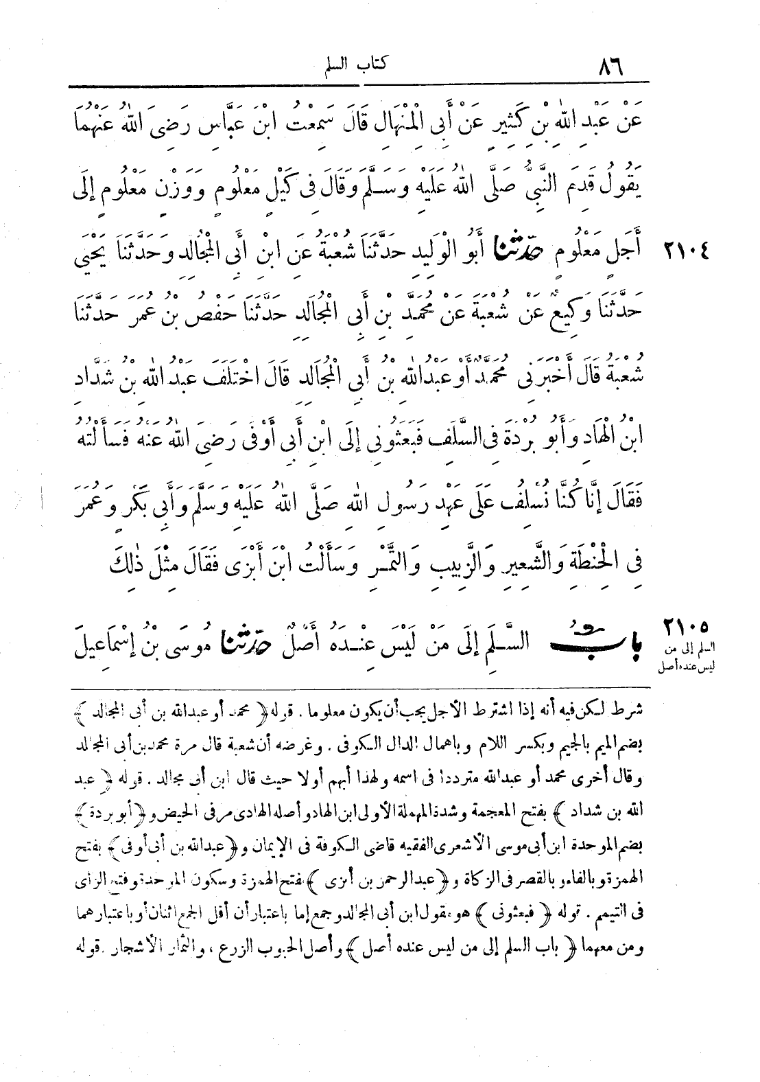 شرط لكن فيه أنه إذا اشترط الأجل يجب أن يكون معلوما, قوله ((محمد أبو عبد الله بن أبي المجالد)) بضم الميم بالجيم وبكسر اللام وبإهمال الدال الكوفي. وغرضه أن شبعه قال مرة محمد بن أبي المجلد وقال أخرى محمد أو عبد الله مترددا في اسمه ولهذا أبهم أولا حيث قال ابن أبي مجالد. قوله ((عبد الله بن شداد)) بفتح المعجمة وشدة المهملة الأولى ابن الهاد وأصله الهادي مر في الحيض و ((أبو بردة)) بضم الموحدة ابن أبي موسى الأشعري الفقيه قاضي الكوفة في الإيمان و ((عبد الله بن أبي أوفي)) بفتح الهمزة وبالفاء وبالقصر في الزكاة و ((عبد الرحمن بن أزى)) بفتح الهمزة وسكون الموحدة وفتح الزاي في التيمم, قوله ((فبعثوني)) هو مقول ابن أبي المجلد وجمع إما باعتبار أن أقل الجمع اثنان أو باعتبارهما ومن معهما ((باب السلم إلى من ليس عنده أصل)) وأصل الحبوب الزرع، والثمار الأشجار. قوله