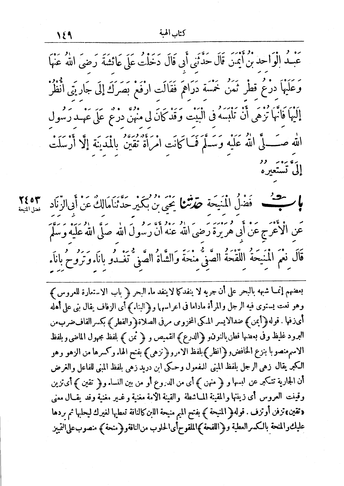 بعضهم إنما شبهه بالبحر على أن جريه لا ينفد كما لا ينفد ماء البحر (باب الاستعارة للعروس) وهو نعت يستوي فيه الرجل والمرأة ما داما في إعراسهما و (البناء) أي الزفاف يقال بني على أهله أي زفها، قوله (أيمن) ضد الأيسر المكي المخزومي مر في الصلاة (والقطر) بكسر القاف ضرب من البرود غليظ وفي بعضها قطن بالنون و (الدرع) القميص و (ثمن) بلفظ مجهول الماضي وبلفظ الاسم منصوباً بنزع الخافض و (انظر) بلفظ الأمر و (تزهى) بفتح الهاء وكسرها من الزهور وهو الكبر يقال زهي الرجل بلفظ المبني للمفعول وحكي ابن دريد زهى بلفظ المبني للفاعل والغرض أن الجارية تتكبر عن لبسها و (منهن) أي من الدروع أو من بين النساء و (تقين) أي تزين وقينت العروس أي زينتها والمقينة الماشطة والقينة الأمة مغنية وغير مغنية وقد يقال معنى «تقين» تزفن أو تزف. قوله (المنيحة) بفتح الميم منيحة اللبن كالناقة تعطيها لغيرك ليحلبها ثم يردها عليك والمنحة بالكسر العطية و (اللفحة) الملقوح أي الحلوب من الناقة و (منحة) منصوب على التمييز