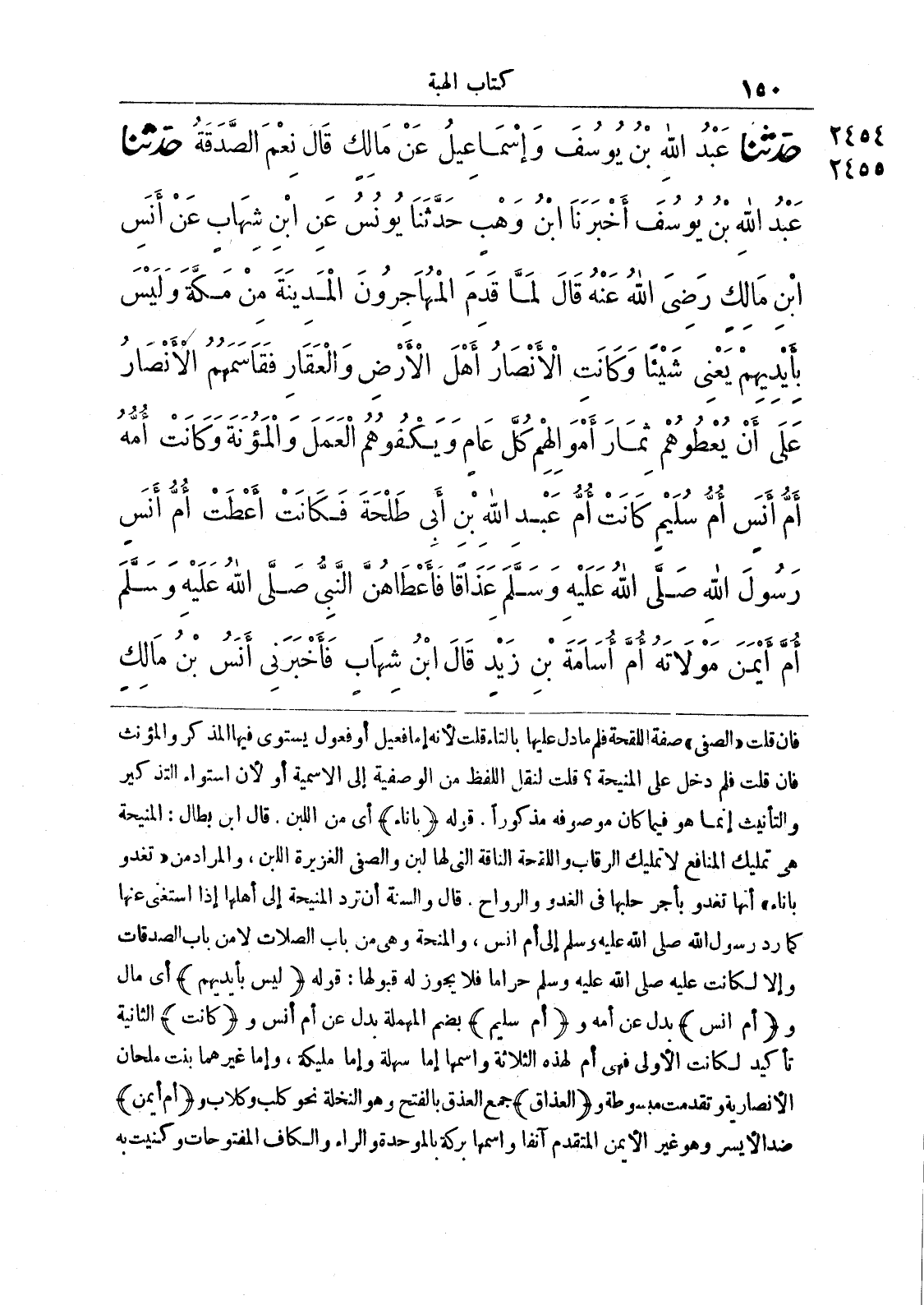 2455 - حَدَّثَنَا عَبْدُ اللَّهِ بْنُ يُوسُفَ أَخْبَرَنَا ابْنُ وَهْبٍ حَدَّثَنَا يُونُسُ عَنْ ابْنِ شِهَابٍ عَنْ أَنَسِ بْنِ مَالِكٍ رَضِيَ اللَّهُ عَنْهُ قَالَ لَمَّا قَدِمَ الْمُهَاجِرُونَ الْمَدِينَةَ مِنْ مَكَّةَ وَلَيْسَ بِأَيْدِيهِمْ يَعْنِي شَيْئًا وَكَانَتْ الْأَنْصَارُ أَهْلَ الْأَرْضِ وَالْعَقَارِ فَقَاسَمَهُمْ الْأَنْصَارُ عَلَى أَنْ