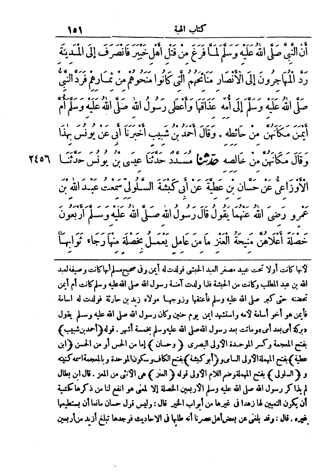 لأنها كانت أولاً تحت عبيد مصغر العبد الحبشي فولدت له أيمن وفي صحيح مسلم أنها كانت وصيفة لعبد الله بن عبد المطلب وكانت من الحبشة فلما ولدت آمنة رسول الله صلى الله عليه وسلم كانت أم أيمن تحضنه حتى كبر صلى الله عليه وسلم فأعتقا وزوجها مولاه زيد بن حارثة فولدت له أسامة فأيمن هو أخو أسامة لأمه واستشهد أيمن يوم حنين وكان رسول الله صلى الله عليه وسلم يقول «بركة أمي بعد أمي» وماتت بعد رسول الله صلى الله عليه وسلم بخمسة أشهر. قوله (أحمد بن شبيب) بفتح المعجمة وكسر الموحدة الأولى البصرى (وحسان) إما من الحس أو من الحسن (ابن عطية) بفتح المهملة الأولى السامي و (أبو كبشة) بفتح الكاف وسكون الموحدة وبالمعجمة اسمه كنيته و (السلولي) بفتح المهملة وضم اللام الأولى قوله (العنز) هي الأنثى من المعز، قال ابن بطال لم يذاكر رسول الله صلى الله عليه وسلم الأربعين الخصلة إلا لمعنى هو أنفع لنا من ذكرها كخشية أن يكون التعيين لها زهداً في غيرها من أبواب الخير قال: وليس قول حسان مانعاً أن يستطيعها غيره، قال: وقد بلغني عن بعض أهل عصرنا أنه طلبها في الأحاديث فوجدها تبلغ أزيد من أربعين