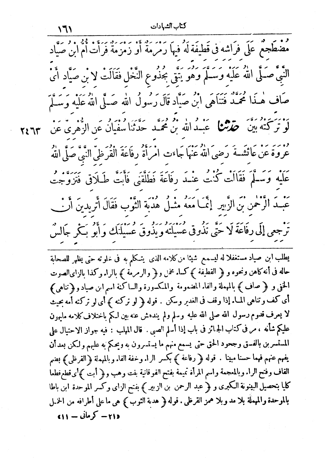 يطلب ابن صياد مستغفلاً له ليسمع شيئاً من كلامه الذي يتكلم به في خلوته حتى يظهر للصحابة حاله في أنه كاهن ونحوه و (القطيفة) كساء مخمل و (والرمرمة) بالراء وكذا بالزاي الصوت الخفي و (صاف) بالمهملة والفاء المضمونة والمكسورة والساكنة اسم ابن صياد و (تناهي) أي كف وتناهي الماء إذا وقف في الغدير وسكن، قوله (لو تركته) أي لو تركته أمه بحيث لا يعرف قدوم رسول الله صلى الله عليه وسلم ولم يندهش عنه بين لكم باختلاف كلامه ما يهون عليكم شأنه، مر في كتاب الجائز في باب إذا أسلم الصبي. قال المهلب: فيه جواز الاحتيال على المستسرين بالفسق وجحود الحق حتى يسمع منهم ما يستسرون به ويحكم به عليهم ولكن بعد أن يفهم عنهم فهماً حسناً مبيناً. قوله (رفاعة) كسر الراء وخفة الفاء وبالمهملة (القرظي) بضم القاف وفتح الراء وبالمعجمة واسم المرأة تميمة بفتح الفوقانية بنت وهب و (أبت) أي قطع قطعاً كليا بتحصيل البينونة الكبرى و (عبد الرحمن بن الزبير) بفتح الزاي وكسر الموحدة ابن باطا بالموحدة والمهملة بلا مد وبلا همز القرظي. قوله (هدية الثوب) هي ما على أطرافه من الخمل