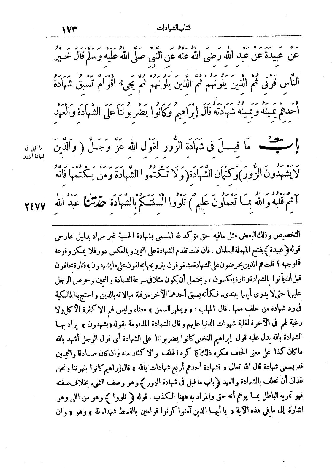 التخصيص وذلك البعض مثل ما فيه حق مؤكد لله المسمى بشهادة الحسبة غير مراد بدليل خارجي قوله (عبيدة) بفتح المهملة السلماني، فإن قلت تقدم الشهادة على اليمين وبالعكس دور فلا يمكن وقوعه فما وجهه؟ قلت هم الذين يحرصون على الشهادة مشغوفون بترويجها يحلفون على ما يشهدون به فتارة يحلفون قبل أن يأتوا بالشهادة وتارة يعكسون، ويحتمل أن يكون مثلاً في سرعة الشهادة واليمين وحرص الرجل عليهما حتى لا يدري بأيهما يبتدئ فكأنه يسبق أحدهما الآخر من قلة مبالاته بالدين واحتج به المالكية في رد شهادة من حلف معها. قال المهلب: «ويظهر السمن» معناه وليس لهم إلا كثرة الأكل ولا رغبة لهم في الآخرة لغلبة شهوات الدنيا عليهم وقال الشهادة المذمومة بقوله «يشهدون» يراد بها الشهادة بالله عليه قول إبراهيم النخعي كانوا يضربونا على الشهادة أي قول الرجل أشهد بالله ما كان كذا على معنى الحلف فكره ذلك كما كره الحلف والإكثار منه وإن كان صادقاً واليمين قد يسمى شهادة قال الله تعالى «فشهادة أحدهم أربع شهادات بالله» قال إبراهيم كانوا ينهوننا ونحن غلمان أن نحلف بالشهادة والعهد (باب ما قيل في شهادة الزور) وهو وصف الشيء بخلاف صفته فهو تمويه الباطل بما يوهم أنه حق والمراد به هاهنا الكذب. قوله (تلووا) وهو من اللي وهو إشارة إلى ما في هذه الآية «يا أيها الذين آمنوا كونوا قوامين بالقسط شهداء لله» وهو «وإن