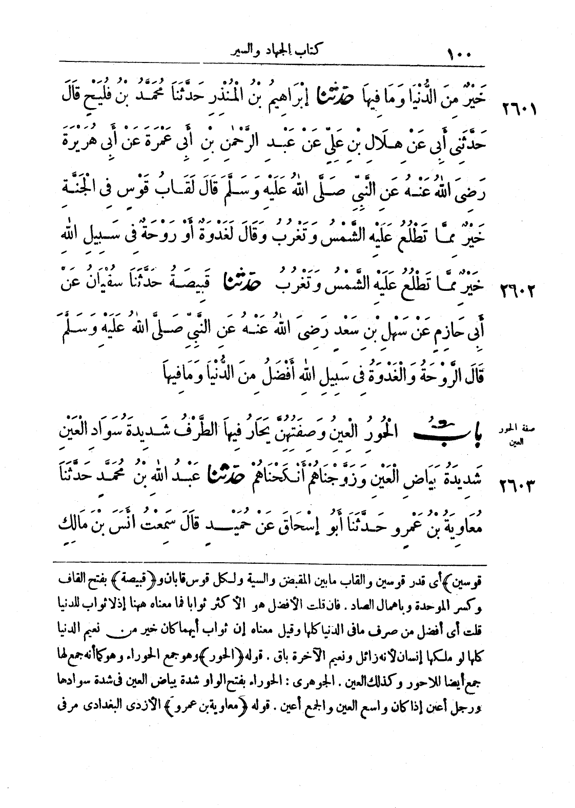 قوسين) أي قدر قوسين وألقاب ما بين المقبض والسية ولكل قوس قابان و (قبيصة) بفتح القاف وكسر الموحدة وبإهمال الصاد. فإن قلت الأفضل هو الأكثر ثواباً فما معناه ههنا إذ لا ثواب للدنيا قلت أي أفضل من صرف ما في الدنيا كلها وقيل معناه إن ثواب أيهما كان خير من نعيم الدنيا كلها لو ملكها إنسان لأنه زائل ونعيم الآخرة باق. قوله (الحور) وهو جمع الحوراء وهو كما أنه جمع لها جمع أيضاً للاحور وكذلك العين. الجوهري: الحوراء بفتح الواو شدة بياض العين في شدة سوادها ورجل أعين إذا كان واسع العين والجمع أعين. قوله (معاوية بن عمرو) الأزدي البغدادي مر في