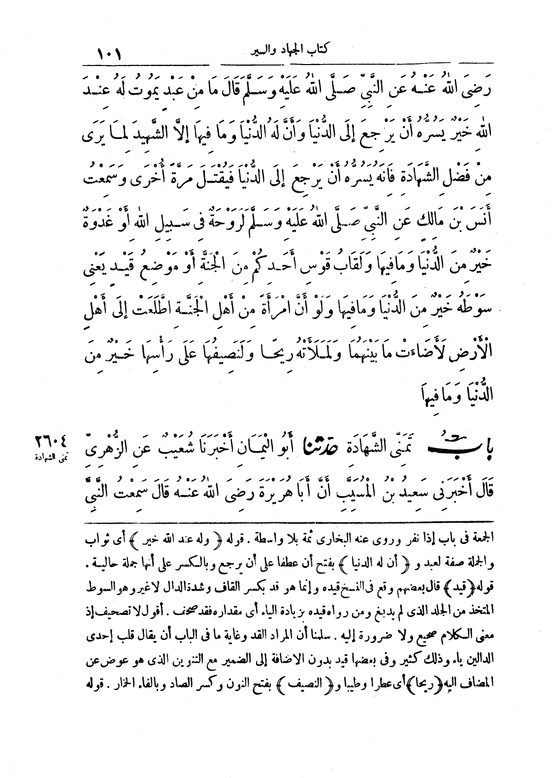 الجمعة في باب إذا نفر وروى عنه البخاري ثمة بلا واسطة. قوله (وله عند الله خير) أي ثواب والجملة صفة لعبد و (أن له الدنيا) بفتح أن عطفاً على أن يرجع وبالكسر على أنها جملة حالية. قوله (قيد) قال بعضهم وقع في النسخ قيده وإنما قد بكسر القاف وشدة الدال لا غير وهو السوط المتخذ من الجلد الذي لم يدبغ ومن رواه قيده بزيادة الياء أي مقداره فقد صحف. أقول لا تصحيف إذ معنى الكلام صحيح ولا ضرورة إليه. سلمنا أن المراد القد وغاية ما في الباب أن يقال قلب إحدى الدالين ياء وذلك كثير وفي بعضها قيد بدون الإضافة إلى الضمير مع التنوين الذي هو عوض عن المضاف إليه (ريحاً) أي عطراً وطيباً و (النصيف) بفتح النون وكسر الصاد وبالفاء الخمار. قوله
