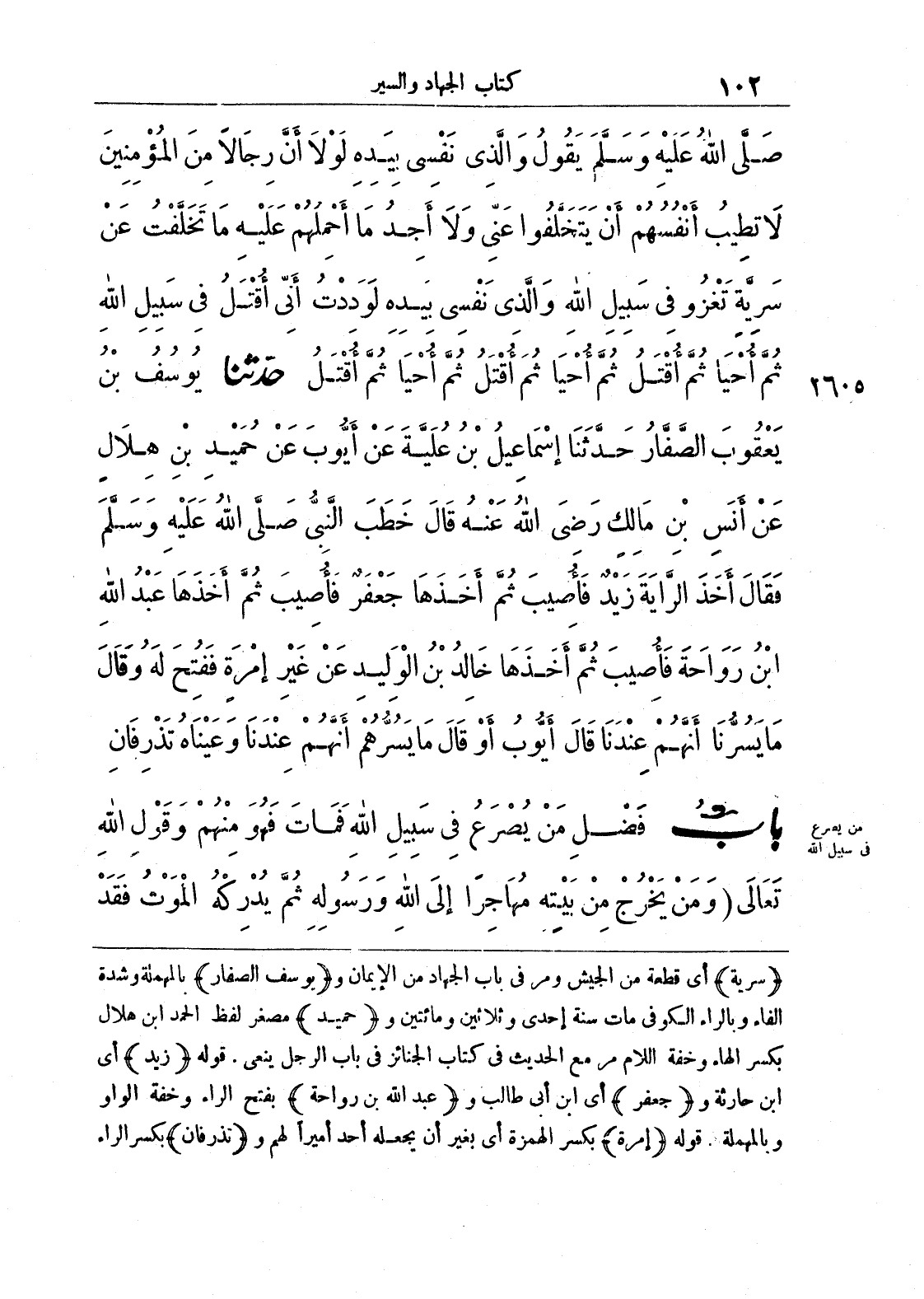 (سرية) أي قطعة من الجيش ومر في باب الجهاد من الإيمان و (يوسف الصفار) بالمهملة وشدة الفاء وبالراء الكوفي مات سنة إحدى وثلاثين ومائتين و (حميد) مصغر لفظ الحمد ابن هلال بكسر الهاء وخفة اللام مر مع الحديث في كتاب الجنائز في باب الرجل ينعى. قوله (زيد) أي ابن حارثة و (جعفر) أي ابن أبي طالب و (عبد الله بن رواحة) بفتح الراء وخفة الواو وبالمهملة قوله (إمرة) بكسر الهمزة أي بغير أن يجعله أحد أميراً لهم و (تذرفان) بكسر الراء