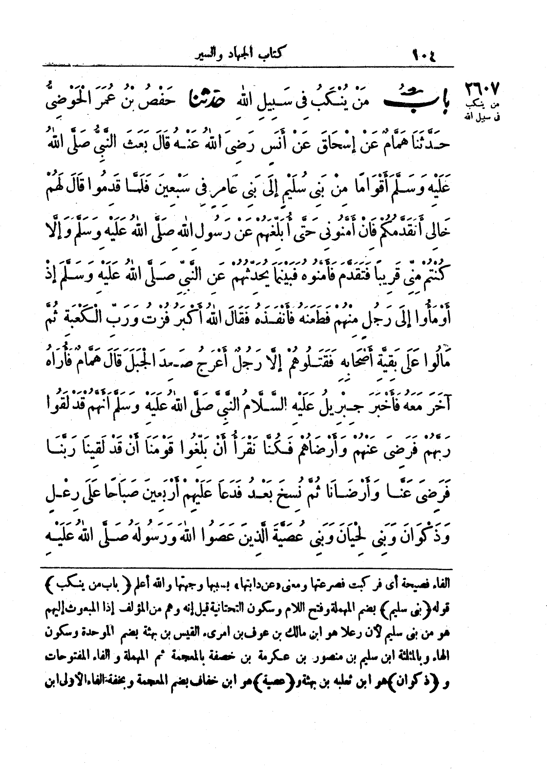 2607 - حَدَّثَنَا حَفْصُ بْنُ عُمَرُ الْحَوْضِيُّ حَدَّثَنَا هَمَّامٌ عَنْ إِسْحَاقَ عَنْ أَنَسٍ رَضِيَ اللَّهُ عَنْهُ قَالَ بَعَثَ النَّبِيُّ صَلَّى اللَّهُ عَلَيْهِ وَسَلَّمَ أَقْوَامًا مِنْ بَنِي سُلَيْمٍ إِلَى بَنِي عَامِرٍ فِي سَبْعِينَ فَلَمَّا قَدِمُوا قَالَ لَهُمْ خَالِي أَتَقَدَّمُكُمْ فَإِنْ أَمَّنُونِي حَتَّى أُبَلِّغَهُمْ عَنْ رَسُولِ اللَّه صَلَّى اللَّهُ عَلَيْهِ وَسَلَّمَ وَإِلَّا كُنْتُمْ مِنِّي قَرِيبًا فَتَقَدَّمَ فَأَمَّنُوهُ فَبَيْنَمَا يُحَدِّثُهُمْ عَنْ النَّبِيِّ صَلَّى اللَّهُ عَلَيْهِ وَسَلَّمَ إِذْ أَوْمَئُوا إِلَى رَجُلٍ مِنْهُمْ فَطَعَنَهُ فَأَنْفَذَهُ فَقَالَ اللَّهُ أَكْبَرُ فُزْتُ وَرَبِّ الْكَعْبَةِ ثُمَّ مَالُوا عَلَى بَقِيَّةِ أَصْحَابِهِ فَقَتَلُوهُمْ إِلَّا رَجُلًا أَعْرَجَ صَعِدَ الْجَبَلَ قَالَ هَمَّامٌ فَأُرَاهُ آخَرَ مَعَهُ فَأَخْبَرَ جِبْرِيلُ عَلَيْهِ السَّلَام النَّبِيَّ صَلَّى اللَّهُ عَلَيْهِ وَسَلَّمَ أَنَّهُمْ قَدْ لَقُوا رَبَّهُمْ فَرَضِيَ عَنْهُمْ وَأَرْضَاهُمْ فَكُنَّا نَقْرَأُ أَنْ بَلِّغُوا قَوْمَنَا أَنْ قَدْ لَقِينَا رَبَّنَا فَرَضِيَ عَنَّا وَأَرْضَانَا ثُمَّ نُسِخَ بَعْدُ فَدَعَا عَلَيْهِمْ أَرْبَعِينَ صَبَاحًا عَلَى رِعْلٍ وَذَكْوَانَ وَبَنِي لَحْيَانَ وَبَنِي عُصَيَّةَ الَّذِينَ عَصَوْا اللَّهَ وَرَسُولَهُ صَلَّى اللَّهُ عَلَيْهِ