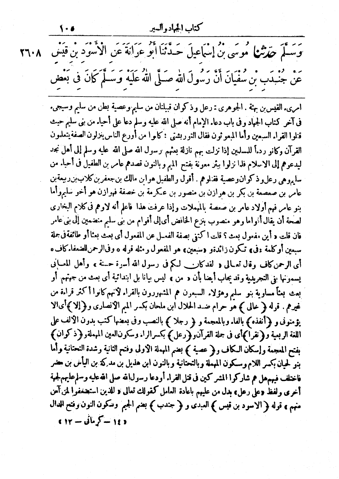 امرئ القيس بن بهثة. الجوهري: رعل وذكوان قبيلتان من سليم وعصية بطن من سليم وسيجيء في آخر كتاب الجهاد وفي باب دعاء الإمام أنه صلى الله عليه وسلم دعا على أحياء من بني سليم حيث قتلوا القراء السبعين وأما المبعوثون فقال التوربشتي: كانوا من أروع الناس ينزلون الصفة يتعلمون القرآن وكانوا ردءاً للمسلمين إذا نزلت بهم نازلة بعثهم رسول الله صلى الله عليه وسلم إلى أهل نجد ليدعوهم إلى الإسلام فلما نزلوا ببئر معونة بفتح الميم وبالنون قصدهم عامر بن الطفيل في أحياء من سليم وهي رعل وذكوان وعصية فقتلوهم. أقول والطفيل هو ابن مالك بن جعفر بن كلاب بن ربيعة بن عامر بن صعصعة بن بكر بن هوازن بن منصور بن عكرمة بن خصفة فهوازن هو أخو سليم وأما بنو عامر فهم أولاد عامر بن صعصعة بالمهملات وإذا عرفت هذا فاعلم أنه لا وهم في كلام البخاري لصحة أن يقال أقواماً وهو منصوب بنزع الخافض أي إلى أقوام من بني سليم منضمين إلى بني عامر فإن قلت ((أين مفعول بعث؟ قلت اكتفى بصفة الفعل عن المفعول أي بعث بعثاً أو طائفة في جملة سبعين أو كلمة ((في)) تكون زائدة و ((سبعين)) هو المفعول ومثله قوله. وفي الرحمن للضعفاء كاف. أي الرحمن كاف وقال تعالى ((لقد كان لكم في رسول الله أسوة حسنة)) وأهل المعاني يسمونها بقى التجريدية وقد يجاب أيضاً بأن ((من)) ليس بياناً بل ابتدائية أي بعث من جهتهم أو بعث بعثاً مساوية بنو سليم وهؤلاء السبعون هم المشهورون بالقراء لأنهم كانوا أكثر قراءة من غيرهم. قوله (خالي) هو حرام ضد الحلال ابن ملحان بكسر الميم الأنصاري و (إلا) أي إلا يؤمنوني و (أنفذه) بالفاء وبالمعجمة و (رجلاً) بالنصب وفي بعضها كتب بدون الألف على اللغة الربعية و (نقرأ) أي في جملة القرآن و (رعل) بكسر الراء وسكون العين المهملة و (ذكوان) بفتح المعجمة وإسكان الكاف و (عصية) بضم المهملة الأولى وفتح الثانية وشدة التحتانية وأما بنو لحيان بكسر اللام وسكون المهملة وبالتحتانية وبالنون ابن هذيل بن مدركة بن اليأس بن مضر فاختلف فيهم هل هم شاركوا المشركين في قتل القراء أو دعا رسول الله صلى الله عليه وسلم عليهم لجهة أخرى ولفظ ((على رعل)) بدل من عليهم بإعادة العامل كقولك تعالى ((للذين استضعفوا لمن آمن منهم)) قوله (الأسود بن قيس) العبدي و (جندب) بضم الجيم وسكون النون وفتح الدال